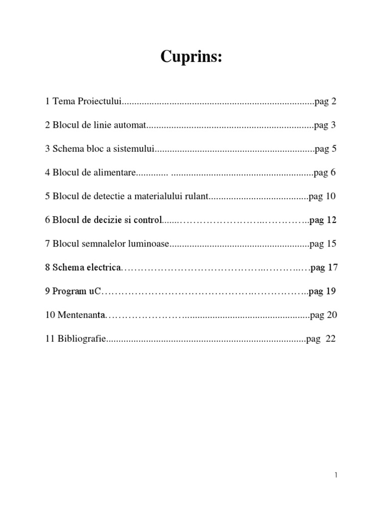 1 Tema Proiectului.............................................................................pag 2 2 Blocul de linie automat...................................................................pag 3 3 Schema bloc a sistemului................................................................pag 5 4 Blocul de alimentare............. .........................................................pag 6 5 Blocul de detectie a materialului rulant........................................pag 10 6 Blocul de decizie si control...........pag 12 7 Blocul semnalelor luminoase........................................................pag 15 8 Schema electrica....pag 17 9 Program uC...pag 19 10 Mentenanta..................................................pag 20 11 Bibliografie................................................................................pag 22