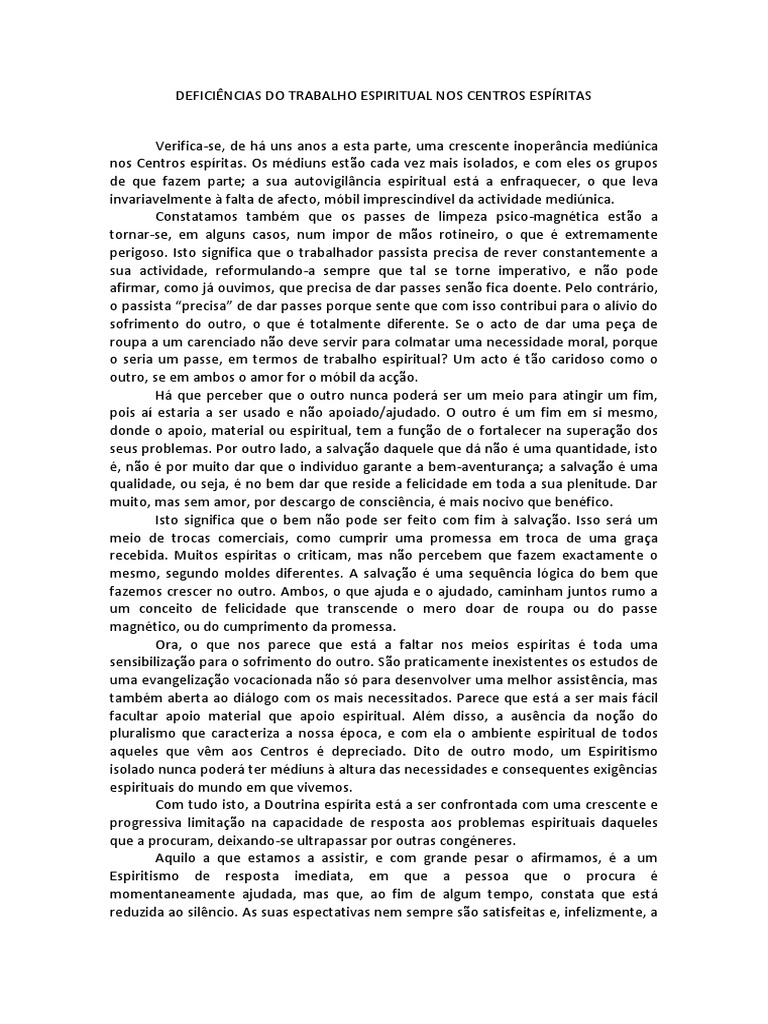nos Centros espritas. Os mdiuns esto cada vez mais isolados, e com eles os grupos de que fazem parte; a sua autovigilncia espiritual est a enfraquecer, o que leva invariavelmente falta de afecto, mbil imprescindvel da actividade medinica. Constatamos tambm que os passes de limpeza psico-magntica esto a tornar-se, em alguns casos, num impor de mos rotineiro, o que extremamente perigoso. Isto significa que o trabalhador passista precisa de rever constantemente a sua actividade, reformulando-a sempre que tal se torne imperativo, e no pode afirmar, como j ouvimos, que precisa de dar passes seno fica doente. Pelo contrrio, o passista precisa de dar passes porque sente que com isso contribui para o alvio do sofrimento do outro, o que totalmente diferente. Se o acto de dar uma pea de roupa a um carenciado no deve servir para colmatar uma necessidade moral, porque o seria um passe, em termos de trabalho espiritual? Um acto to caridoso como o outro, se em ambos o amor for o mbil da aco. H que perceber que o outro nunca poder ser um meio para atingir um fim, pois a estaria a ser usado e no apoiado/ajudado. O outro um fim em si mesmo, donde o apoio, material ou espiritual, tem a funo de o fortalecer na superao dos seus problemas. Por outro lado, a salvao daquele que d no uma quantidade, isto , no por muito dar que o indivduo garante a bem-aventurana; a salvao uma qualidade, ou seja, no bem dar que reside a felicidade em toda a sua plenitude. Dar muito, mas sem amor, por descargo de conscincia, mais nocivo que benfico. Isto significa que o bem no pode ser feito com fim salvao. Isso ser um meio de trocas comerciais, como cumprir uma promessa em troca de uma graa recebida. Muitos espritas o criticam, mas no percebem que fazem exactamente o mesmo, segundo moldes diferentes. A salvao uma sequncia lgica do bem que fazemos crescer no outro. Ambos, o que ajuda e o ajudado, caminham juntos rumo a um conceito de felicidade que transcende o mero doar de roupa ou do passe magntico, ou do cumprimento da promessa. Ora, o que nos parece que est a faltar nos meios espritas toda uma sensibilizao para o sofrimento do outro. So praticamente inexistentes os estudos de uma evangelizao vocacionada no s para desenvolver uma melhor assistncia, mas tambm aberta ao dilogo com os mais necessitados. Parece que est a ser mais fcil facultar apoio material que apoio espiritual. Alm disso, a ausncia da noo do pluralismo que caracteriza a nossa poca, e com ela o ambiente espiritual de todos aqueles que vm aos Centros depreciado. Dito de outro modo, um Espiritismo isolado nunca poder ter mdiuns altura das necessidades e consequentes exigncias espirituais do mundo em que vivemos. Com tudo isto, a Doutrina esprita est a ser confrontada com uma crescente e progressiva limitao na capacidade de resposta aos problemas espirituais daqueles que a procuram, deixando-se ultrapassar por outras congneres. Aquilo a que estamos a assistir, e com grande pesar o afirmamos, a um Espiritismo de resposta imediata, em que a pessoa que o procura momentaneamente ajudada, mas que, ao fim de algum tempo, constata que est reduzida ao silncio. As suas espectativas nem sempre so satisfeitas e, infelizmente, a