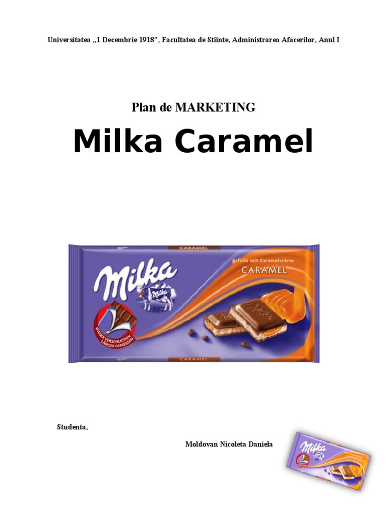 Motivatia realizarii proiectului: Am intocmit acest plan pentru a diferentia produsul nostru, Milka cu caramel de restul concurentilor si pentru a le oferi potentialilor consumatori motive pentru care sa cumpere ciocolata noastra. Teoretic, motivul intocmirii acestui plan consta in identificarea pozitiei actuale pe piata, determinarea oportunitatilor si resurselor necesare realizarii scopului propus. Prezentarea organizatiei (Misiunea): Misiunea noastra este aceea de a oferi clientilor nostri produsul Milka cu caramel de o calitate superioara, siguranta in consum si un nivel de satisfactie cat mai ridicat. Prezentarea problemei: Avand in vedere faptul ca firma noastra detine o mare parte din vanzarile pietei de ciocolata cu caramel si comercializeaza o ciocolata de calitate superioara, consideram o proplema importanata faptul ca nu am ajuns inca lideri de piata. Scopul proiectului: In contextul unei piete competitive a ciocolatei si a faptului ca firma nu a reusit sa atinga un volum de vanzari a ciocolatei cu caramel in anul 2012 suficient pentru a ajunge lider de piata, scopul nostru este acela de a de a deveni lider de piata in anul 2013. Obiective generale ale proiectului : Cresterea notorietatii cu 50% pentru produsul Milka Caramel pana la data de 31.12.2013 ; Cresterea volumului de vanzari cu 40% pentru Milka Caramel pana la data de 31.12.2013; Fidelizarea clientilor Milka Caramel cu 50%..