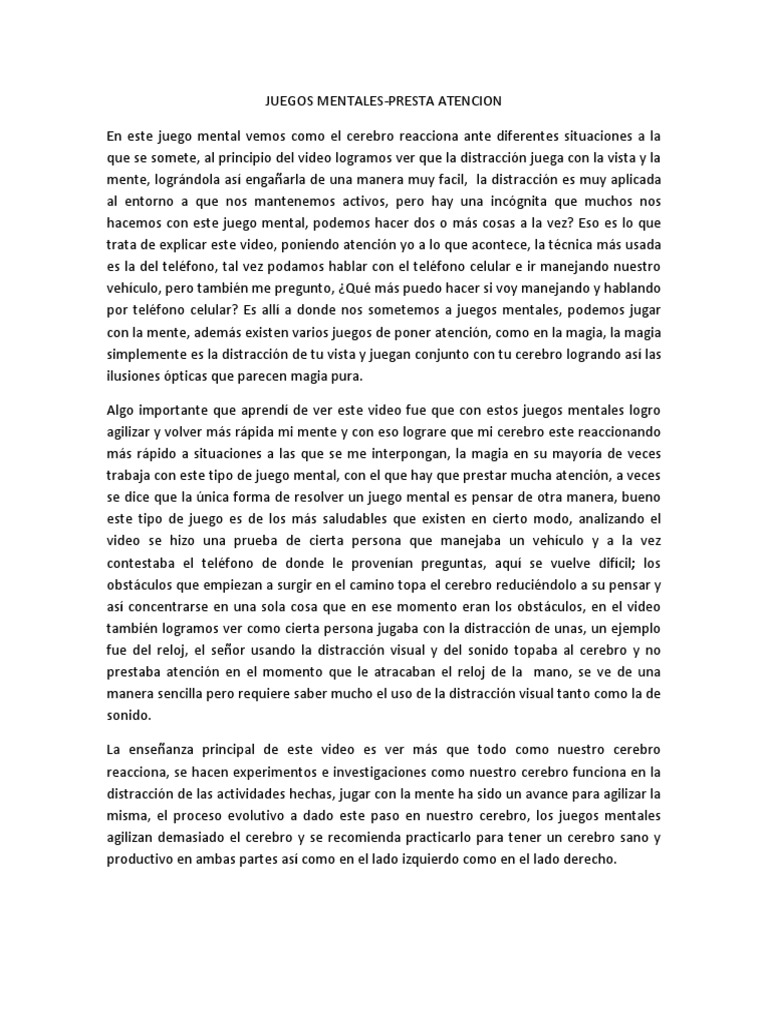al principio del video logramos ver que la distraccin juega con la vista y la mente, logrndola as engaarla de una manera muy facil, la distraccin es muy aplicada al entorno a que nos mantenemos activos, pero hay una incgnita que muchos nos hacemos con este juego mental, podemos hacer dos o ms cosas a la vez? Eso es lo que trata de explicar este video, poniendo atencin yo a lo que acontece, la tcnica ms usada es la del telfono, tal vez podamos hablar con el telfono celular e ir manejando nuestro vehculo, pero tambin me pregunto, Qu ms puedo hacer si voy manejando y hablando por telfono celular? Es all a donde nos sometemos a juegos mentales, podemos jugar con la mente, adems existen varios juegos de poner atencin, como en la magia, la magia simplemente es la distraccin de tu vista y juegan conjunto con tu cerebro logrando as las ilusiones pticas que parecen magia pura. Algo importante que aprend de ver este video fue que con estos juegos mentales logro agilizar y volver ms rpida mi mente y con eso lograre que mi cerebro este reaccionando ms rpido a situaciones a las que se me interpongan, la magia en su mayora de veces trabaja con este tipo de juego mental, con el que hay que prestar mucha atencin, a veces se dice que la nica forma de resolver un juego mental es pensar de otra manera, bueno este tipo de juego es de los ms saludables que existen en cierto modo, analizando el video se hizo una prueba de cierta persona que manejaba un vehculo y a la vez contestaba el telfono de donde le provenan preguntas, aqu se vuelve difcil; los obstculos que empiezan a surgir en el camino topa el cerebro reducindolo a su pensar y as concentrarse en una sola cosa que en ese momento eran los obstculos, en el video tambin logramos ver como cierta persona jugaba con la distraccin de unas, un ejemplo fue del reloj, el seor usando la distraccin visual y del sonido topaba al cerebro y no prestaba atencin en el momento que le atracaban el reloj de la mano, se ve de una manera sencilla pero requiere saber mucho el uso de la distraccin visual tanto como la de sonido. La enseanza principal de este video es ver ms que todo como nuestro cerebro reacciona, se hacen experimentos e investigaciones como nuestro cerebro funciona en la distraccin de las actividades hechas, jugar con la mente ha sido un avance para agilizar la misma, el proceso evolutivo a dado este paso en nuestro cerebro, los juegos mentales agilizan demasiado el cerebro y se recomienda practicarlo para tener un cerebro sano y productivo en ambas partes as como en el lado izquierdo como en el lado derecho.