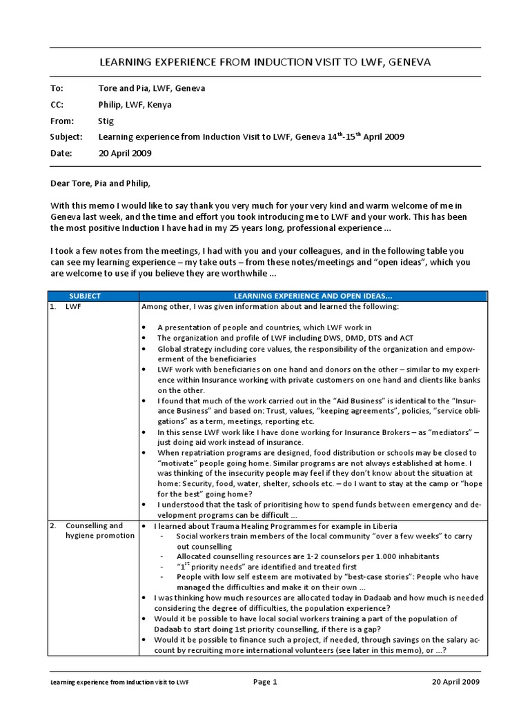Dear Tore, Pia and Philip, With this memo I would like to say thank you very much for your very kind and warm welcome of me in Geneva last week, and the time and effort you took introducing me to LWF and your work. This has been the most positive Induction I have had in my 25 years long, professional experience ... I took a few notes from the meetings, I had with you and your colleagues, and in the following table you can see my learning experience my take outs from these notes/meetings and open ideas, which you are welcome to use if you believe they are worthwhile ...