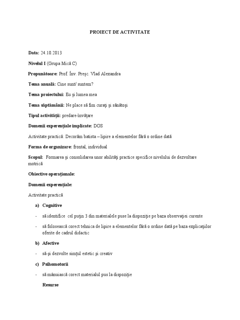 Data: 24.10.2013 Nivelul I (Grupa Mic C) Propuntoare: Prof. nv. Prec. Vlad Alexandra Tema anual: Cine un!" un!e#$ Tema proiectului: %u i lu#ea #ea Tema sptmnii: &e place fi# curai i n!oi Tipul activitii: predare'(nvare Domenii expereniale implicate: )*+ Ac!ivi!a!e prac!ic, )ecor# -a!i !a . lipire a ele#en!elor fr o ordine da! Forma e or!ani"are: fron!al/ individual #copul: 0or#area i con olidarea unor a-ili!i prac!ice pecifice nivelului de de1vol!are #o!ric O$iective operaionale: Domenii expereniale: Ac!ivi!a!e prac!ic a% Co!nitive ' ' iden!ifice cel puin 3 din #a!erialele pu e la di po1i2ie pe -a1a o- ervaiei curen!e folo ea c corec! !e3nica de lipire a ele#en!elor fr o ordine da! pe -a1a explicaiilor oferi!e de cadrul didac!ic