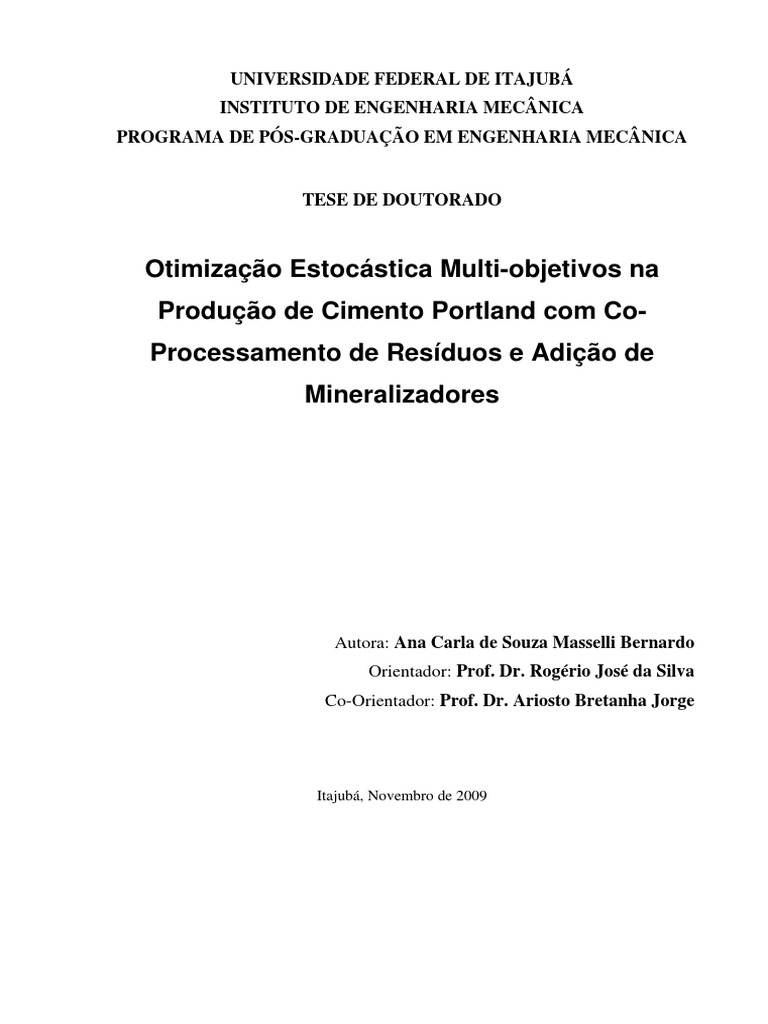 BERNARDO, A. C. S. M. (2009). Otimizao Estocstica Multi-Objetivos na Produo de Cimento Portland com Co-Processamento de Resduos e Adio de Mineralizadores, Itajub, 205 p. Tese (Doutorado em Converso de Energia) Instituto de Engenharia Mecnica, Universidade Federal de Itajub.