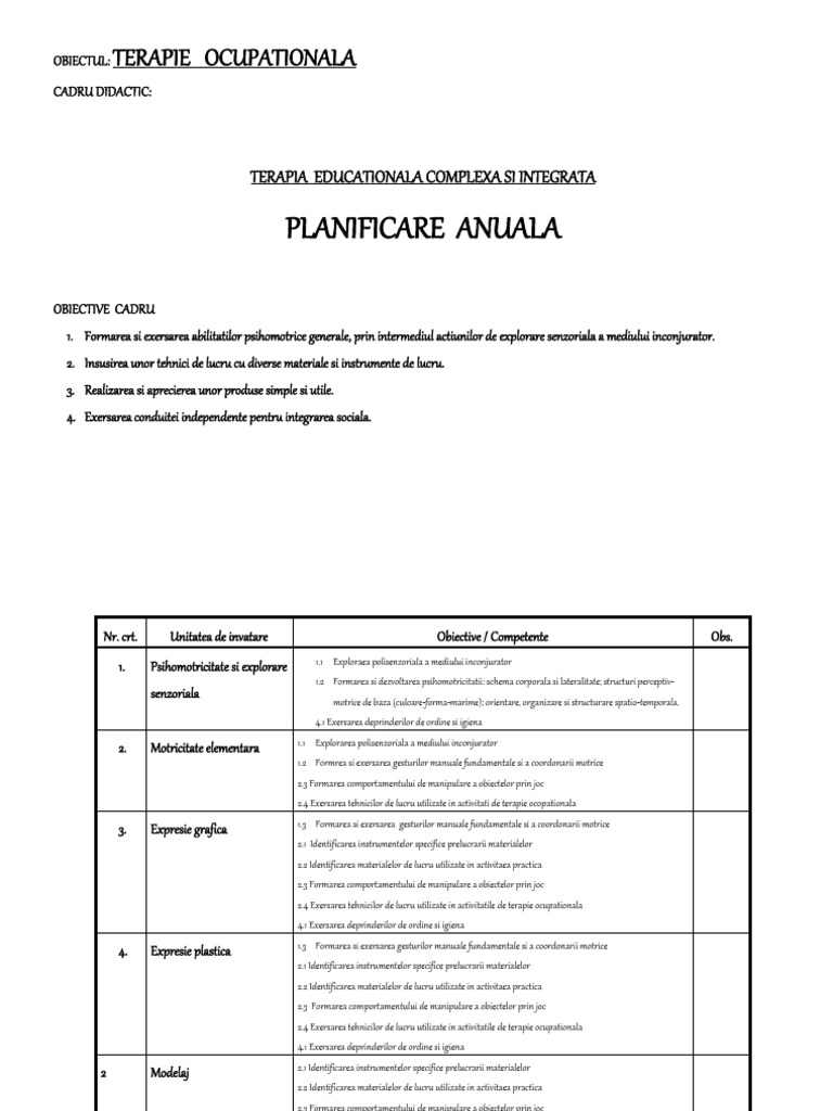 2.1 Identificarea instrumentelor specifice prelucrarii materialelor 2.2 Identificarea materialelor de lucru utilizate in activitaea practica 2.3 Formarea comportamentului de manipulare a obiectelor prin joc 2.4 Exersarea tehnicilor de lucru utilizate in activitatile de terapie ocupationala 3.1 Invatarea etapelor/operatiilor de realizare a unor produse simple 3.2 Realizarea de produse simple, utilizand tehnicile invatate 3.3 Analizarea, descrierea si aprecierea produsului finit 4.1 Exersarea deprinderilor de ordine si igiena 4.2 Exersarea conduitei independente prin activitati cu caracter ergoterapeutic.
