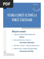Pentru grinda din figur: 1. Stabilii cantitatea minim de armtur longitudinal conform coeficientului minim de armare dat n SR EN1992-1 2. Reprezentai configuraia grinzii cu zbrele echivalente pentru calculul la for tietoare conform modelului din SR EN 1992-1, considernd un unghi de nclinare al diagonalei comprimate de 31. 3. Calculai fora VRd,s corespunztoare unghiului =31 considernd o armare transversal curent cu etrieri cu dou ramuri 10/250mm. 4. Reprezentai calitativ o schi de armare de principiu pentru grind, evideniind zona c u etrieri ndesii.