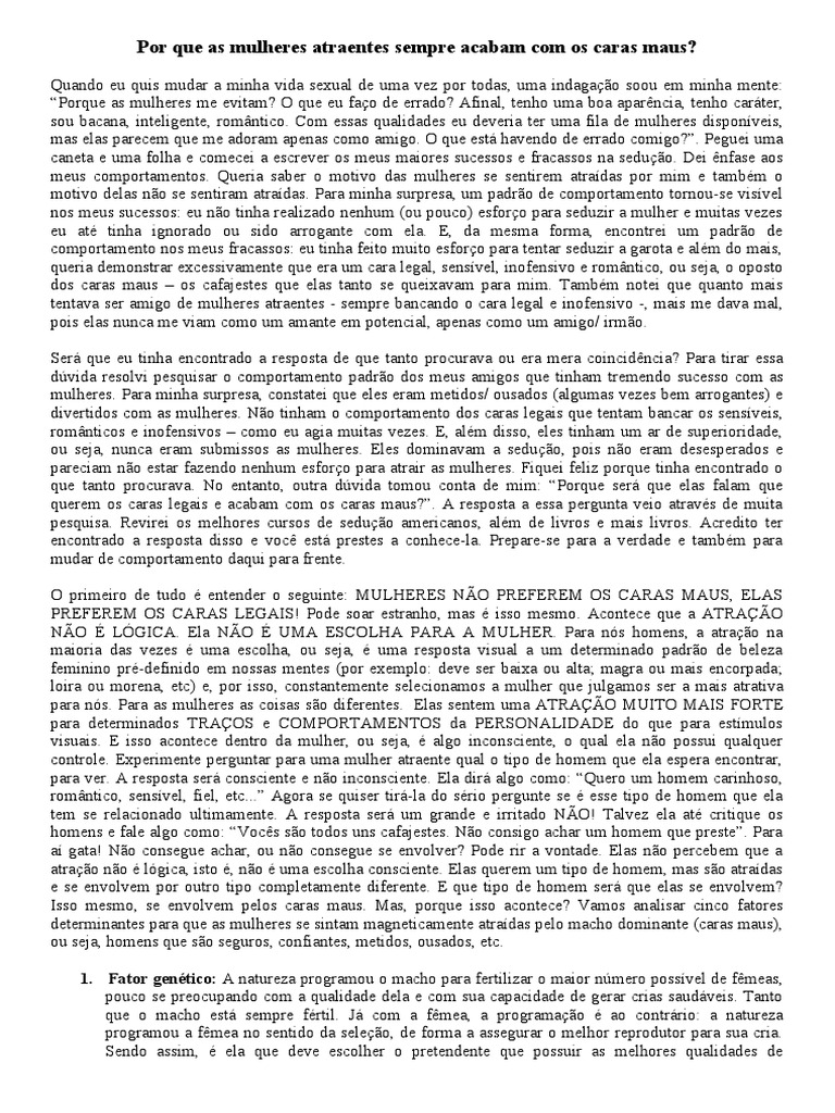 atração não é lógica, isto é, não é uma escolha consciente. Elas querem um tipo de homem, mas são atraídas e se envolvem por outro tipo completamente diferente. E que tipo de homem será que elas se envolvem? Isso mesmo, se envolvem pelos caras maus. Mas, porque isso acontece? Vamos analisar cinco fatores determinantes para que as mulheres se sintam magneticamente atraídas pelo macho dominante (caras maus), ou seja, homens que são seguros, confiantes, metidos, ousados, etc.