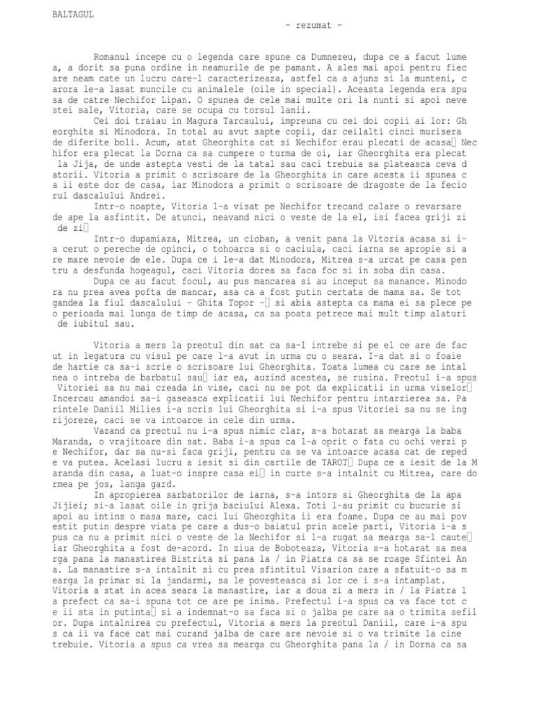 BALTAGUL - rezumat Romanul incepe cu o legenda care spune ca Dumnezeu, dupa ce a facut lume a, a dorit sa puna ordine in neamurile