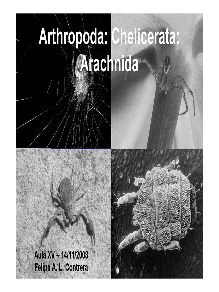 70.000 espécies descritas; 1 milhão estimadas; Incluem: aranhas, escorpiões, ácaros, carrapatos e outros menos familiares; 11 grandes grupos, 80% são aranhas e ácaros; Quase todos carnívoros terrestres;