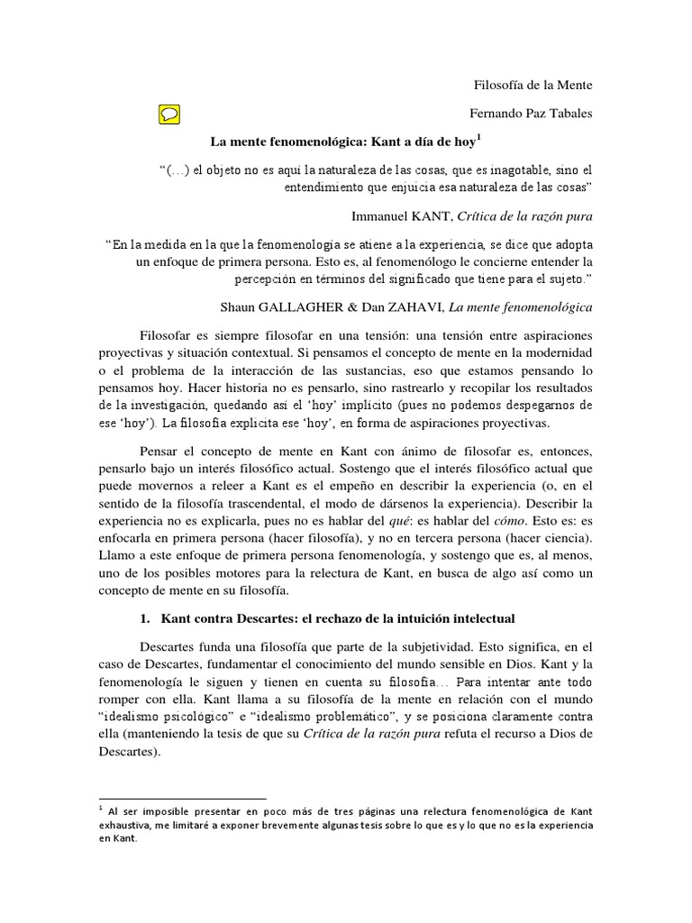 es inagotable, sino el entendimiento que enjuicia esa naturaleza de las cosas Immanuel KANT, Crtica de la razn pura En la medida en la que la fenomenologa se atiene a la experiencia, se dice que adopta un enfoque de primera persona. Esto es, al fenomenlogo le concierne entender la percepcin en trminos del significado que tiene para el sujeto. Shaun GALLAGHER & Dan ZAHAVI, La mente fenomenolgica Filosofar es siempre filosofar en una tensin: una tensin entre aspiraciones proyectivas y situacin contextual. Si pensamos el concepto de mente en la modernidad o el problema de la interaccin de las sustancias, eso que estamos pensando lo pensamos hoy. Hacer historia no es pensarlo, sino rastrearlo y recopilar los resultados de la investigacin, quedando as el hoy implcito (pues no podemos despegarnos de ese hoy). La filosofa explicita ese hoy, en forma de aspiraciones proyectivas. Pensar el concepto de mente en Kant con nimo de filosofar es, entonces, pensarlo bajo un inters filosfico actual. Sostengo que el inters filosfico actual que puede movernos a releer a Kant es el empeo en describir la experiencia (o, en el sentido de la filosofa trascendental, el modo de drsenos la experiencia). Describir la experiencia no es explicarla, pues no es hablar del qu: es hablar del cmo. Esto es: es enfocarla en primera persona (hacer filosofa), y no en tercera persona (hacer ciencia). Llamo a este enfoque de primera persona fenomenologa, y sostengo que es, al menos, uno de los posibles motores para la relectura de Kant, en busca de algo as como un concepto de mente en su filosofa. 1. Kant contra Descartes: el rechazo de la intuicin intelectual Descartes funda una filosofa que parte de la subjetividad. Esto significa, en el caso de Descartes, fundamentar el conocimiento del mundo sensible en Dios. Kant y la fenomenologa le siguen y tienen en cuenta su filosofa Para intentar ante todo romper con ella. Kant llama a su filosofa de la mente en relacin con el mundo idealismo psicolgico e idealismo problemtico, y se posiciona claramente contra ella (manteniendo la tesis de que su Crtica de la razn pura refuta el recurso a Dios de Descartes).