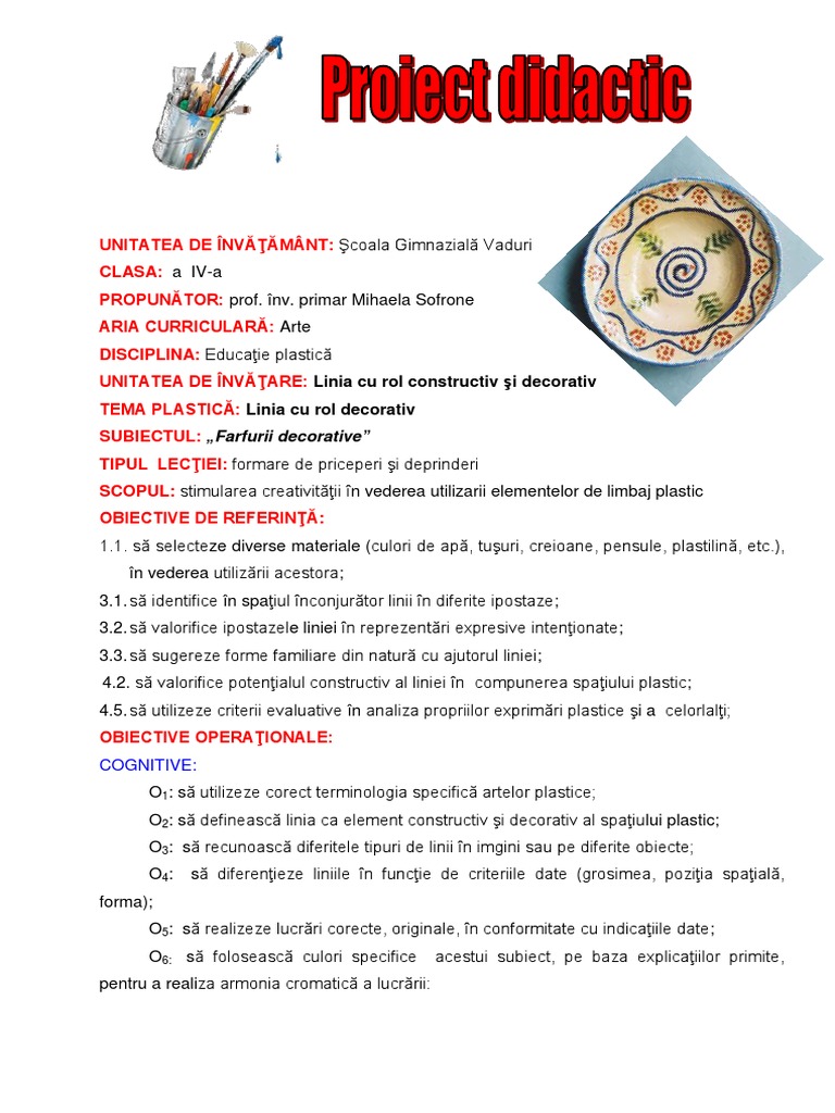 primar Mihaela Sofrone ARIA CURRICULAR: Arte DISCIPLINA: Educaie plastic UNITATEA DE NVARE: Linia cu rol constructiv i decorativ TEMA PLASTIC: Linia cu rol decorativ SUBIECTUL: Farfurii decorative TIPUL LECIEI: formare de priceperi i deprinderi SCOPUL: stimularea creativitii n vederea utilizarii elementelor de limbaj plastic OBIECTIVE DE REFERIN: 1.1. s selecteze diverse materiale (culori de ap, tuuri, creioane, pensule, plastilin, etc.), n vederea utilizrii acestora; 3.1. s identifice n spaiul nconjurtor linii n diferite ipostaze; 3.2. s valorifice ipostazele liniei n reprezentri expresive intenionate; 3.3. s sugereze forme familiare din natur cu ajutorul liniei; 4.2. s valorifice potenialul constructiv al liniei n compunerea spaiului plastic; 4.5. s utilizeze criterii evaluative n analiza propriilor exprimri plastice i a celorlali; OBIECTIVE OPERAIONALE: COGNITIVE: O1: s utilizeze corect terminologia specific artelor plastice; O2: s defineasc linia ca element constructiv i decorativ al spaiului plastic; O3: s recunoasc diferitele tipuri de linii n imgini sau pe diferite obiecte; O4: forma); O5: s realizeze lucrri corecte, originale, n conformitate cu indicaiile date ; O6: s foloseasc culori specifice pentru a realiza armonia cromatic a lucrrii: acestui subiect, pe baza explicaiilor primite, s diferenieze liniile n funcie de criteriile date (grosimea, poziia spaial,