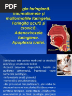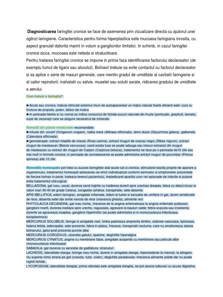 etc. simptomelesunt dureri intermitente in gatlej si la deglutitie si o uscaciune a faringelui care obliga bolnavul sa-si dreaga vocea tot timpul. La o examinare nu se distinge decat o simpla roseata [Link] faringitelor cronice este dificil si se asociaza celui al cauzei, atunci cand ea este determinata, ingrijirile locale (aerosoli, colutorii etc.) si curele termale.