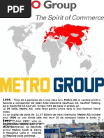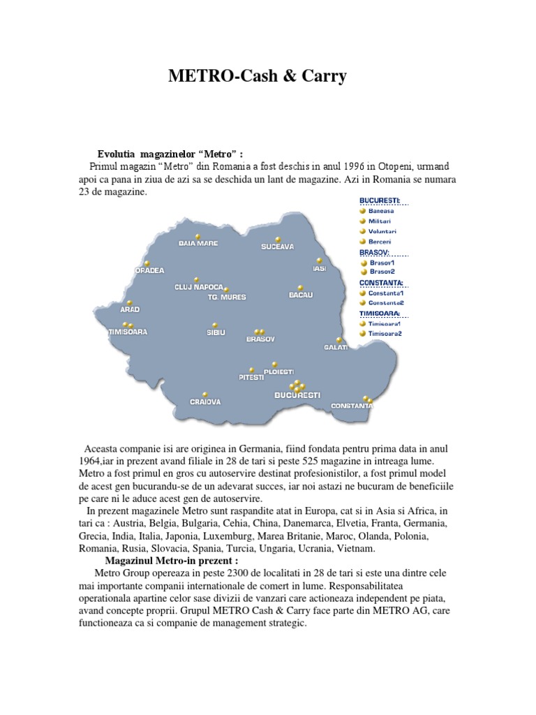 Aceasta companie isi are originea in Germania, fiind fondata pentru prima data in anul 1964,iar in prezent avand filiale in 28 de tari si peste 525 magazine in intreaga lume. Metro a fost primul en gros cu autoservire destinat profesionistilor, a fost primul model de acest gen bucurandu-se de un adevarat succes, iar noi astazi ne bucuram de beneficiile pe care ni le aduce acest gen de autoservire. In prezent magazinele Metro sunt raspandite atat in Europa, cat si in Asia si Africa, in tari ca : Austria, Belgia, Bulgaria, Cehia, China, Danemarca, Elvetia, Franta, Germania, Grecia, India, Italia, Japonia, Luxemburg, Marea Britanie, Maroc, Olanda, Polonia, Romania, Rusia, Slovacia, Spania, Turcia, Ungaria, Ucrania, Vietnam. Magazinul Metro-in prezent : Metro Group opereaza in peste 2300 de localitati in 28 de tari si este una dintre cele mai importante companii internationale de comert in lume. Responsabilitatea operationala apartine celor sase divizii de vanzari care actioneaza independent pe piata, avand concepte proprii. Grupul METRO Cash & Carry face parte din METRO AG, care functioneaza ca si companie de management strategic.