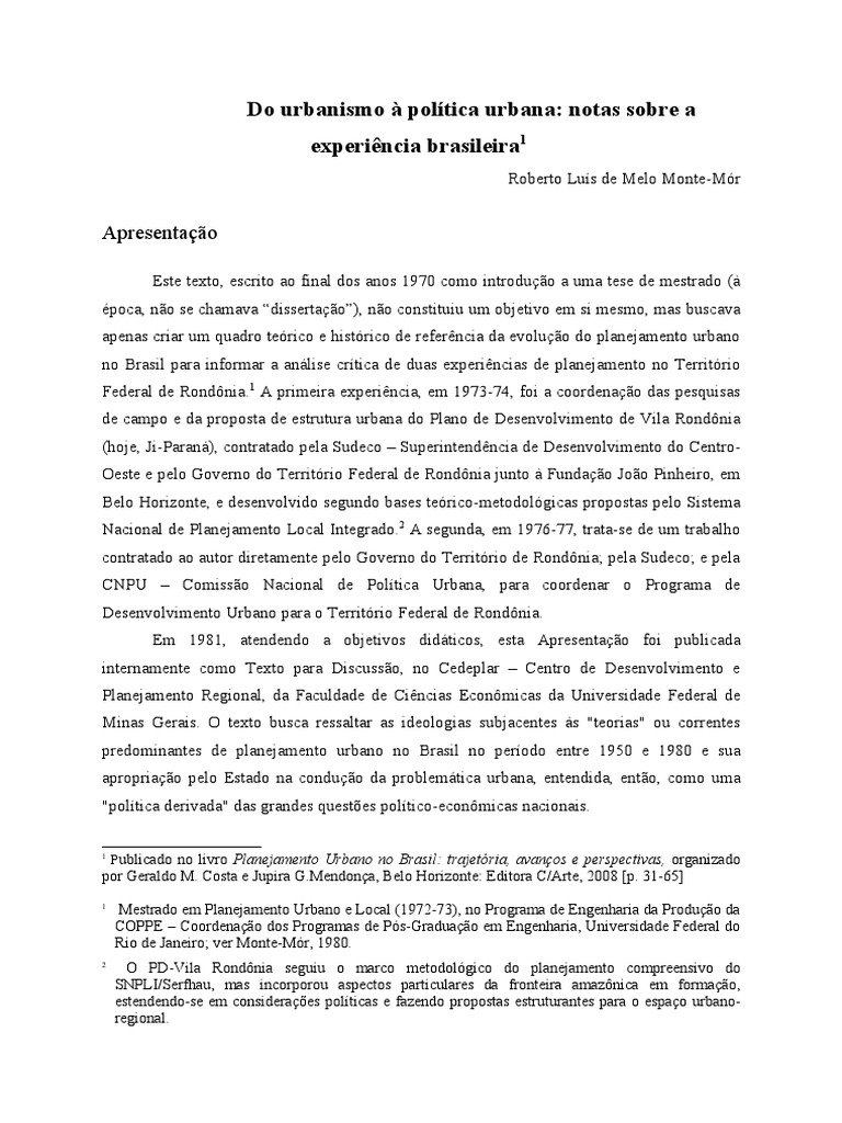 Este texto, escrito ao final dos anos 197 co!o introduo a u!a tese de !estrado "# $poca, no se c%a!a&a 'dissertao(), no constituiu u! ob*eti&o e! si !es!o, !as busca&a apenas criar u! +uadro terico e %istrico de refer,ncia da e&oluo do plane*a!ento urbano no -rasil para infor!ar a an.lise crtica de duas experi,ncias de plane*a!ento no /erritrio 0ederal de Rond1nia21 A pri!eira experi,ncia, e! 1973-74, foi a coordenao das pes+uisas de ca!po e da proposta de estrutura urbana do 5lano de 6esen&ol&i!ento de 7ila Rond1nia "%o*e, 8i-5aran.), contratado pela 9udeco : 9uperintend,ncia de 6esen&ol&i!ento do ;entro<este e pelo =o&erno do /erritrio 0ederal de Rond1nia *unto # 0undao 8oo 5in%eiro, e! -elo >ori?onte, e desen&ol&ido se@undo bases terico-!etodol@icas propostas pelo 9iste!a Aacional de 5lane*a!ento Local Bnte@rado2C A se@unda, e! 197D-77, trata-se de u! trabal%o contratado ao autor direta!ente pelo =o&erno do /erritrio de Rond1niaE pela 9udecoE e pela ;A5F : ;o!isso Aacional de 5oltica Frbana, para coordenar o 5ro@ra!a de 6esen&ol&i!ento Frbano para o /erritrio 0ederal de Rond1nia2 E! 19G1, atendendo a ob*eti&os did.ticos, esta Apresentao foi publicada interna!ente co!o /exto para 6iscusso, no ;edeplar : ;entro de 6esen&ol&i!ento e 5lane*a!ento Re@ional, da 0aculdade de ;i,ncias Econ1!icas da Fni&ersidade 0ederal de Minas =erais2 < texto busca ressaltar as ideolo@ias sub*acentes #s HteoriasH ou correntes predo!inantes de plane*a!ento urbano no -rasil no perodo entre 19I Hpoltica deri&adaH das @randes +uestJes poltico-econ1!icas nacionais2