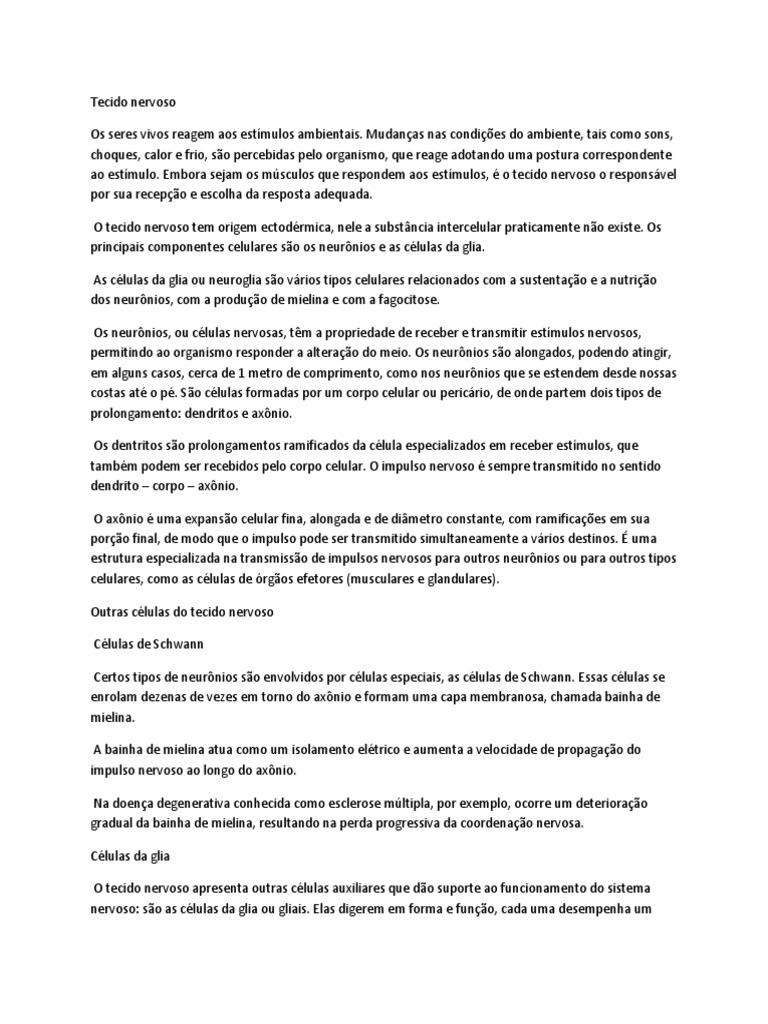 Mudanas nas condies do ambiente, tais como sons, choques, calor e frio, so percebidas pelo organismo, que reage adotando uma postura correspondente ao estmulo. Embora sejam os msculos que respondem aos estmulos, o tecido nervoso o responsvel por sua recepo e escolha da resposta adequada. O tecido nervoso tem origem ectodrmica, nele a substncia intercelular praticamente no existe. Os principais componentes celulares so os neurnios e as clulas da glia. As clulas da glia ou neuroglia so vrios tipos celulares relacionados com a sustentao e a nutrio dos neurnios, com a produo de mielina e com a fagocitose. Os neurnios, ou clulas nervosas, tm a propriedade de receber e transmitir estmulos nervosos, permitindo ao organismo responder a alterao do meio. Os neurnios so alongados, podendo atingir, em alguns casos, cerca de 1 metro de comprimento, como nos neurnios que se estendem desde nossas costas at o p. So clulas formadas por um corpo celular ou pericrio, de onde partem dois tipos de prolongamento: dendritos e axnio. Os dentritos so prolongamentos ramificados da clula especializados em receber estmulos, que tambm podem ser recebidos pelo corpo celular. O impulso nervoso sempre transmitido no sentido dendrito corpo axnio. O axnio uma expanso celular fina, alongada e de dimetro constante, com ramificaes em sua poro final, de modo que o impulso pode ser transmitido simultaneamente a vrios destinos. uma estrutura especializada na transmisso de impulsos nervosos para outros neurnios ou para outros tipos celulares, como as clulas de rgos efetores (musculares e glandulares). Outras clulas do tecido nervoso Clulas de Schwann Certos tipos de neurnios so envolvidos por clulas especiais, as clulas de Schwann. Essas clulas se enrolam dezenas de vezes em torno do axnio e formam uma capa membranosa, chamada bainha de mielina. A bainha de mielina atua como um isolamento eltrico e aumenta a velocidade de propagao do impulso nervoso ao longo do axnio. Na doena degenerativa conhecida como esclerose mltipla, por exemplo, ocorre um deteriorao gradual da bainha de mielina, resultando na perda progressiva da coordenao nervosa. Clulas da glia O tecido nervoso apresenta outras clulas auxiliares que do suporte ao funcionamento do sistema nervoso: so as clulas da glia ou gliais. Elas digerem em forma e funo, cada uma desempenha um