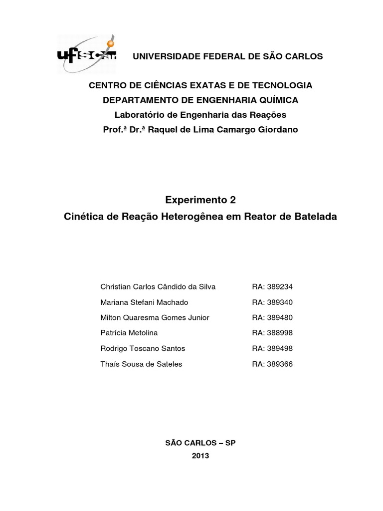 CENTRO DE CINCIAS EXATAS E DE TECNOLOGIA DEPARTAMENTO DE ENGENHARIA QUMICA Laboratrio de Engenharia das Reaes Prof. Dr. Raquel de Lima Camargo Giordano