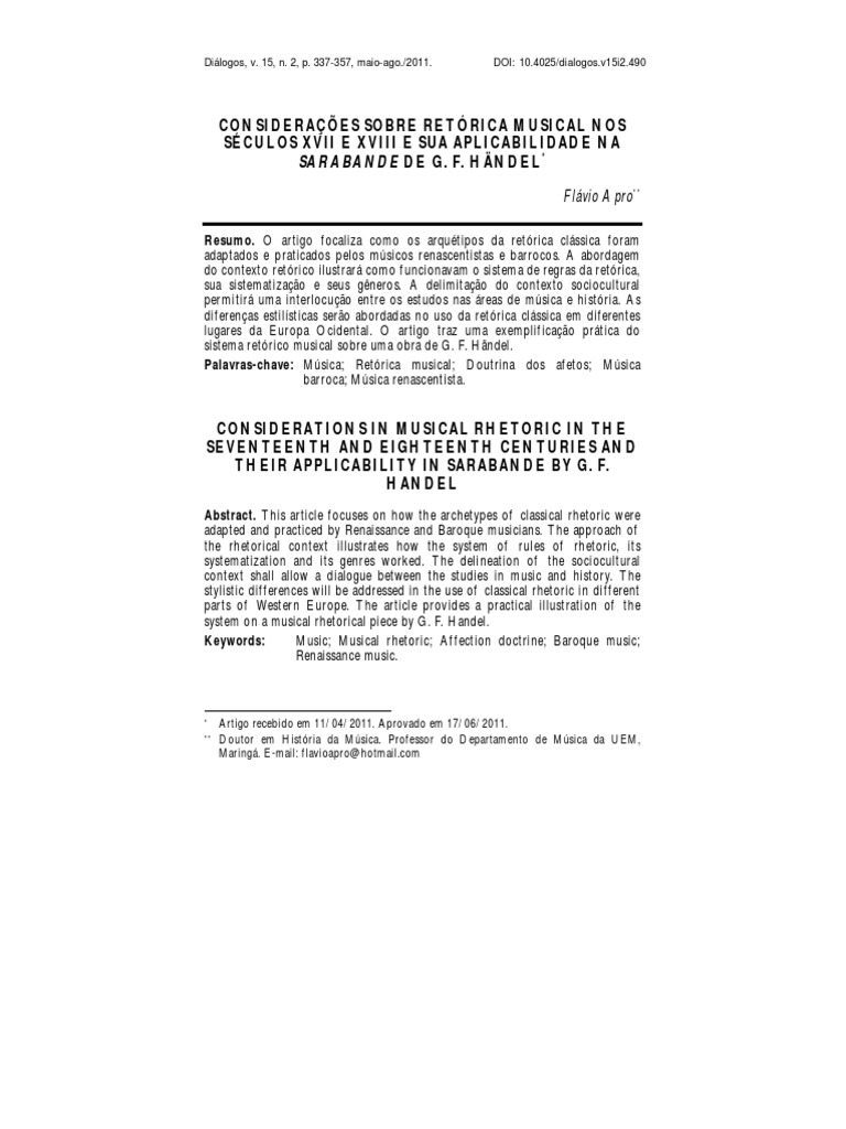 XVII e XVIII. Essa estreita relao da poltica com os cdigos retricos teve uma natural extenso no que se referia ao aspecto do uso ideolgico e propagandstico francs durante o reinado de Lus XIV e das demais cortes que encomendavam obras, promoviam a difuso musical e incentivavam compositores e msicos. Percebemos, ao longo do artigo, como que as diferentes localidades e nacionalidades particularizaram no apenas o estilo musical, mas tambm a forma de expresso retrica: mais contida nos pases que adotaram o estilo do norte europeu e, inversamente, mais explcita nos pases meridionais. Um detalhamento mais tcnico foi levantado na anlise de alguns procedimentos que envolvem a elocuo na composio, ou seja, como efetivamente a retrica foi apropriada e utilizada como um cdigo compartilhado entre compositores, msicos e ouvintes: seja na escolha do andamento musical e da tonalidade, at gestos musicais que exploram os sentimentos (ou afetos, como se nomeava poca), tanto na msica vocal quanto na instrumental. Foi revelado tambm como que determinados gneros musicais, como o Tema e Variaes, possuem razes comuns disposio do discurso na Oratria, visando efeitos especficos nos ouvintes. A obra instrumental Sarabande de Hndel foi escolhida para exemplificar os gestos, as figuras, e demais procedimentos que podem ser associados retrica clssica, pois, como todo compositor culto da poca, a assimilao do pensamento retrico era algo natural para um compositor de alto escalo na esfera social, como foi o caso deste compositor. REFERNCIAS APRO, Flvio. Folias de Espanha: o eterno retorno. So Paulo, 2009. Tese (Doutorado em Msica) - Universidade de So Paulo, 2009. ASSUMPO, Srgio Eduardo. Ascendncia Retrica das Formas Musicais . So Paulo, 2007 Dissertao (Mestrado em Msica) - Universidade de So Paulo, 2007.