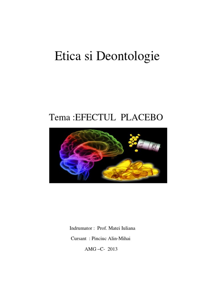 Sursa de profit pentru vindecatori Jumatate din medicii americani prescriu tratamente false cel putin o data pe luna, fie pentru a-si linisti pacientii ipohondri, fie pentru a le da o speranta celor pentru care medicina traditionala nu mai poate face nimic, arata un studiu realizat in 2008. Oricat de bine ar suna insa ideea vindecarii de la sine, nu traim intr-o lume in care miracolele rasar la tot pasul. Efectul placebo nu functioneaza la toti pacientii, iar neaplicarea unui tratament bine fundamentat in favoarea unuia de tip placebo poate fi periculoasa, crede medicul Dragos Popa. Daca doctorii se gandesc de zece ori inainte sa-i prescrie unui pacient un medicament fara valoare curativa, vindecatorii au ajuns sa se imbogateasca de pe seama capacitatii organismului uman de a-si reveni singur. Peste tot in lume exista binefacatori care pretind ca isi vindeca pacientii operandu-i cu un cutit de bucatarie sau radiindu-i cu un aparat construit dintr-un videorecorder vechi si stricat. Si, pentru ca orice personaj pozitiv trebuie sa aiba un opus, exista si efectul nocebo, care apare atunci cand pacientul se simte mai rau dupa ce primeste o pastila, reala sau falsa, de exemplu daca nu are incredere in terapie. Puterea gandului functioneaza, asadar, si in sens invers. Un studiu facut in anii 1990 arata ca femeile care cred ca sunt predispuse la boli de inima au un risc de deces aproape de patru ori mai mare decat cele care nu le impartasesc gandurile fataliste. Caracterele generale ale efectului placebo : - substana administrat este inert farmacodinamic; - efectul este simptomatic; - durata efectului este, de regul, scurt. - instalarea efectului este mai rapid dect a unei substane farmacodinamice active; - aciunea este nespecific. FAPTE :