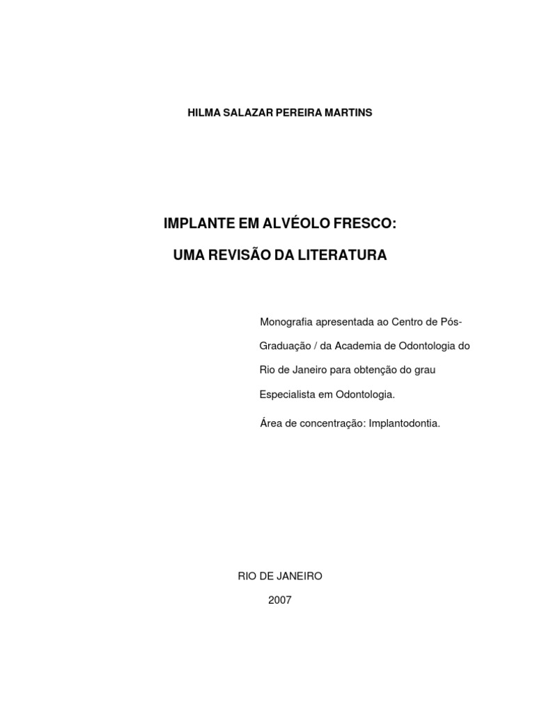 Martins, Hilma. Implante em alvéolo fresco: uma revisão da