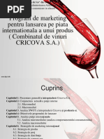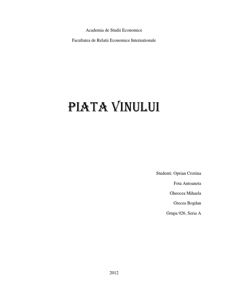 1.1: Scurt istoric al produsului la nivel mondial si national: Romnia este o important ar european productoare de vin, dispunnd de un mare trecut istoric si de bogate tradiii culturale, mare parte din ele nemijlocit legate de aceast bautur, considerat, pe drept cuvant, o licoare divin. Astzi, ara parcurge o perioad de profunde schimbri, construindu-i un viitor in consonan cu cel al Uniunii Europene si va deveni un membru apreciat al comunitii internaionale a vinului ca productor al unor preuite vinuri de nalt calitate. Piaa vinului este o pia matur afectat puternic de evoluiile favorabile sau defavorabile determinate de obisnuinele alimentare si comportamentul de cumprare al consumatorilor. Chiar daca pieele dominante (european si nord american) par mai degrab stabile, tendinele au o scdere constanta a cererii si o modificare a preferinelor consumatorilor ctre vinul de calitate n detrimentul vinului de mas. n rile tradiional productoare i consumatoare de vin, consumul de vin ordinar se diminueaza rapid, n timp ce consumul vinului de calitate crete lent. Comportamentul pieei pare s fie determinat de deviza s bei mai putin, dar s bei mai bine. Dei vinul este comercializat internaional,nu exist o pia internaionala a vinului n sensul curent al pieei internaionale. Aceasta deoarece rile consumatoare sunt n acelai timp producatoare,asigurndu-i aprovizionarea n proporie de 100%. Piaa vinului cuprinde mai multe segmente. Segmentul cel mai important este cel al vinurilor stabilizate care poate fi divizat n mai multe grupe: vinuri de calitate medie ctre mediocre i vinuri de calitate superioar supus unor reglementri i specificaii stricte. Piaa vinului n general,dar n particular cea european,se caracterizeaz prin excedente structurale. Producia de vin depeste potenialul de consum naional i eventualele cantiti destinate pieelor internaionale. n final,sistemul de distribuie a vinului reproduce aceeai schem peste tot in lume, i anume, el este foarte fragmentat cu un numr foarte mare de detailiti rspandii peste tot n teritoriu. Se