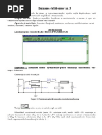 se gasesc libr"rii cu modele #i simboluri grafice de la produc"torii importan!i de componente electronice pentru integrarea lor n simul"ri. 3.1. Etapele simul#rii - Se denumesc nodurile #i componentele circuitului care trebuie analizat. - Se creeaz" fi#ierul corespunz"tor de circuit (<nume>.CIR) folosind editorul PSpice. - Se execut" simularea SPICE folosind fi#ierul de circuit creat anterior. - Se vizualizeaz" rezultatele simul"rii, care se afl" n fi#ierul de circuit <nume>.OUT, folosind editorul PSpice, sau orice alt editor de text. - Se vizualizeaz" formele de und" rezultate n urma simul"rii folosind fereastra Probe, datele fiind memorate n fi#ierul de date <nume>.DAT . 3.2. Fi$ierul de circuit Structura fi#ierului de circuit este urm"toarea: - Linie de titlu. Exist", indiferent ce con!ine. - *Comentarii. Sunt op!ionale, ns" foarte utile pentru mbun"t"!irea clarit"!ii fi#ierului de circuit. Obligatoriu exist" * la inceput. - Instruc!iuni pentru adresarea unor biblioteci. Ex. .LIB c:\pspice\L2\LIB\[Link] - Descrierea componentelor circuitului: nume n cadrul circuitului, nodurile ntre care este conectat", valoarea - dac" este component" pasiv", sau tipul componentei - dac" este component" activ". Ex. R15 2 3 1k D7 5 6 D1N4148 - Instruc!iuni care descriu tipul analizei ce trebuie efectuat". Ex. .TRAN 10nS 100uS - Instruc!iuni care descriu ce date #i sub ce form" s" fie salvate n urma simul"rii n fi#ierele de ie#ire. Ex. .FOUR 50Hz V(2) .PROBE - Instruc!iunea .END . 3.3. Conven%ii folosite n fi$ierul de circuit Pentru editarea fi#ierului de circuit este necesar ca fiecare nod din circuit s" primeasc" un nume. Numele unui nod poate avea maxim 128 de caractere alfanumerice. Este obligatoriu ca un nod din circuit s" fie masa, care prime#te prin conven!ie numele "0". Celelalte noduri pot fi denumite arbitrar #i nu este necesar s" fie n secven!a 1, 2, 3 etc.