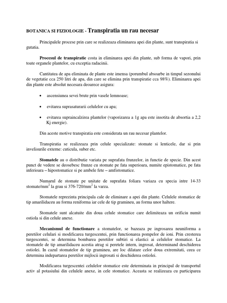 BOTANICA SI FIZIOLOGIE - Transpiratia