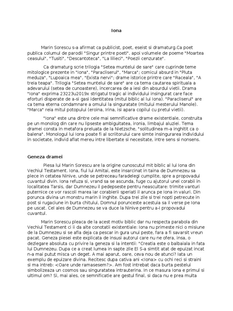 Marin Sorescu s-a afirmat ca publicist, poet, eseist si [Link] poet publica columul de parodii "Singur printre poeti", apoi volumele de poeme "Moartea ceasului", "Tusiti", "Descantoteca", "La lilieci", "Poezii cenzurate". Ca dramaturg scrie trilogia "Setea muntelui de sare" care cuprinde teme mitologice prezente in " ona", "Paracliserul", "Marca"! comicul absurd in "Pluta meduza", "Lupoaica mea", ""#ista nervi"! drame istorice printre care "$aceala", "% treia teapa". Trilogia "Setea muntelui de sare" are ca tema cautarea spirituala a adevarului &setea de cunoastere', incercarea de a iesi din absurdul vietii. Drama " ona" e#prima ()(()u(*+,# strigatul tragic al individului insingurat care face eforturi disperate de a-si gasi identitatea &mitul biblic al lui ona'. "Paracliserul" are ca tema eterna condamnare a omului la singuratate &mitului mesterului Manole'. "Marca" reia mitul potopului &eroina, rina, isi apara copilul cu pretul vietii'. " ona" este una dintre cele mai semnificative drame e#istentiale, construita pe un monolog din care nu lipseste ambiguitatea, ironia, limba-ul aluziei. Tema dramei consta in metafora preluata de la .ietzsc/e, "solitudinea m-a ing/itit ca o balena". Monologul lui ona poate fi al scriitorului care simte insingurarea individului in societate, individ aflat mereu intre libertate si necesitate, intre sens si nonsens.