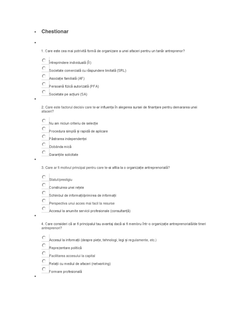 1. Care este cea mai potrivit form de organizare a unei afaceri pentru un tanr antreprenor? ntreprindere individual (I) Societate comercial cu rspundere limitat (SRL) Asociaie familial (AF) Persoan fizic autorizat (PFA) Societate pe aciuni (SA)