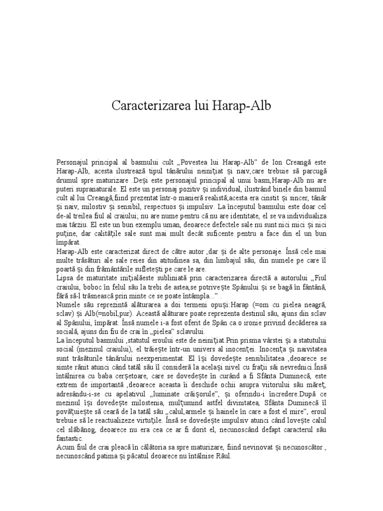Personajul principal al basmului cult Povestea lui Harap-Alb de Ion Creang este Harap-Alb, acesta ilustreaz tipul tnrului neiniiat i naiv,care trebuie s parcug drumul spre maturizare !ei este personajul principal al unui basm,Harap-Alb nu are puteri supranaturale "l este un personaj pozitiv i individual, ilustrnd binele din basmul cult al lui Creang,#iind prezentat $ntr-o manier realist%acesta era cinstit i sincer, tnr i naiv, milostiv i sensibil, respectuos i impulsiv &a $nceputul basmului este doar cel de-al treilea #iul al craiului% nu are nume pentru c nu are identitate, el se va individualiza mai trziu "l este un bun e'emplu uman, deoarece de#ectele sale nu sunt nici mici i nici puine, dar calitile sale sunt mai mult dect su#icente pentru a #ace din el un bun $mprat Harap-Alb este caracterizat direct de ctre autor ,dar i de alte personaje (ns cele mai multe trsturi ale sale reies din atitudinea sa, din limbajul su, din numele pe care $l poart i din #rmntrile su#leteti pe care le are &ipsa de maturitate iniialeste subliniat prin caracterizarea direct a autorului )iul craiului, boboc $n #elul su la trebi de astea,se potrive te *pnului i se bag $n #ntn, #r s-l trsneasc prin minte ce se poate $ntmpla +umele su reprezint alturarea a doi termeni opui,Harap -.om cu pielea neagr, sclav/ i [Link],pur/ Aceast alturare poate reprezenta destinul su, ajuns din sclav al *pnului, $mprat (ns numele i-a #ost o#erit de *pn ca o ironie privind decderea sa social, ajuns din #iu de crai $n pielea sclavului &a $nceputul basmului ,statutul eroului este de neini iat Prin prisma vrstei i a statutului social -mezinul craiului/, el triete $ntr-un univers al inocenei Inocena i naivitatea sunt trsturile tnrului nee'perimentat "l $ i dovedete sensibilitatea ,deoarece se simte rnit atunci cnd tatl su $l consider la acela i nivel cu #raii si nevrednici (ns $ntlnirea cu baba ceretoare, care se dovedete $n curnd a #i *#nta !uminec, este e'trem de important ,deoarece aceasta $i desc0ide oc0ii asupra viitorului su mre, adresndu-i-se cu apelativul luminate criorule, i o#erindu-i $ncredere !up ce mezinul $i dovedete milostenia, mulumind ast#el divinitatea, *#nta !uminec $l povuiete s cear de la tatl su calul,armele i 0ainele $n care a #ost el mire, eroul trebuie s le reactualizeze virtuile (ns se dovedete impulsiv atunci cnd lovete calul cel slbnog, deoarece nu era cea ce ar #i dorit el, necunoscnd de#apt caracterul su #antastic Acum #iul de crai pleac $n cltoria sa spre maturizare, #iind nevinovat i necunosctor , necunoscnd patima i pcatul deoarece nu $ntlnise 1ul