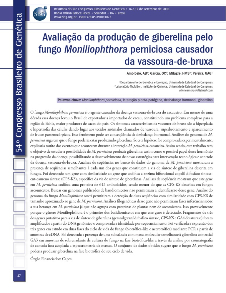 o objetivo de estudar a possibilidade de M. perniciosa produzir giberelina; assim como o possível papel desse hormônio