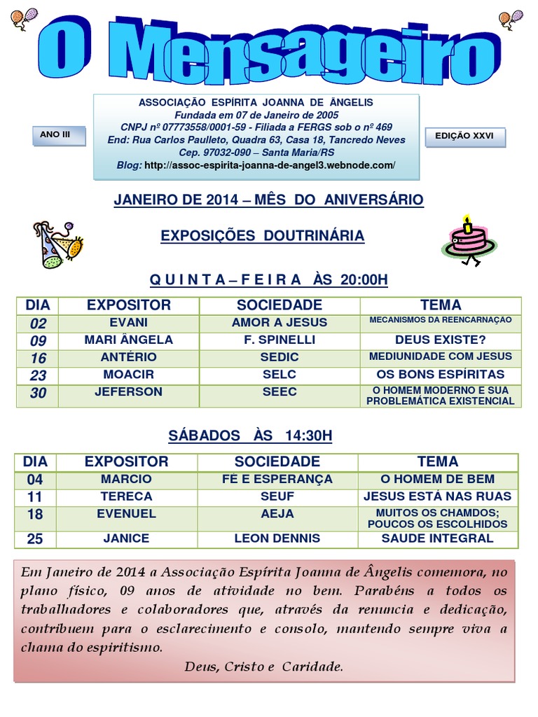 JANEIRO DE 2014 MS DO ANIVERSRIO EXPOSIES DOUTRINRIA Q U I N T A F E I R A S 20:00H DIA 02 09 16 23 30 EXPOSITOR