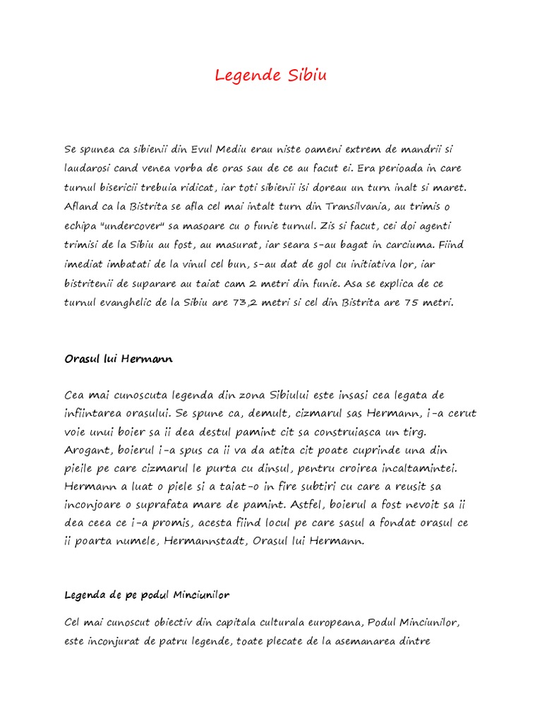 Orasul lui Hermann Cea mai cunoscuta legenda din zona Sibiului este insasi cea legata de infiintarea orasului. Se spune ca, demult, cizmarul sas Hermann, i-a cerut voie unui boier sa ii dea destul pamint cit sa construiasca un tirg. Arogant, boierul i-a spus ca ii va da atita cit poate cuprinde una din pieile pe care cizmarul le purta cu dinsul, pentru croirea incaltamintei. Hermann a luat o piele si a taiat-o in fire subtiri cu care a reusit sa inconjoare o suprafata mare de pamint. Astfel, boierul a fost nevoit sa ii dea ceea ce i-a promis, acesta fiind locul pe care sasul a fondat orasul ce ii poarta numele, Hermannstadt, Orasul lui Hermann.