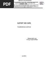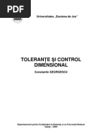 mijloacelor de msurare 5. TOLERANELE I AJUSTAJELE PIESELOR LISE. SISTEME DE TOLERANE I AJUSTAJE 5.1 Sistemul ISO de tolerane i ajustaje . 5.2 Sistemul STAS de tolerante si ajustaje 5.3 Indicaii cu privire la alegerea preciziei i a ajustajelor .. 5.4 Toleranele cotelor ( dimensiunilor ) fr indicaii de tolerane 6. TOLERANELE RULMENILOR I AJUSTAJELE ASAMBLRILOR CU RULMENI . 6.1 Jocurile n rulmeni 6.2 Ajustajele asamblrilor rulment arbore i rulment carcas 7 CONTROLUL DIMENSIUNILOR I SUPRAFEELOR CU AJUTORUL CALIBRELOR LIMITATIVE 7.1 Clasificarea i principiul de lucru al calibrelor . 8. TOLERANELE, AJUSTAJELE I CONTROLUL PIESELOR I ASAMBLRILOR CONICE NETEDE . 8.1 Elemente dimensionale principale .. 8.2 Precizia asamblrilor conice i toleranele unghiurilor i conicitilor 8.3 Mijloace speciale pentru controlul pieselor conice i al unghiurilor 9. TOLERANELE, AJUSTAJELE I CONTROLUL PIESELOR I ASAMBLRILOR FILETATE . 9.1 Elemente dimensionale ale filetelor . 9.2 Relaii ntre abaterile diametrului mediu, pasului i unghiului flancurilor . 9.3 Toleranele i ajustajele filetelor metrice ISO de fixare 10. TOLERANELE ROILOR I ANGRENAJELOR CU ROI DINATE CILINDRICE .. 11 TOLERANELE, AJUSTAJELE I CONTROLUL ASAMBLRILOR CU PENE 12 TOLERANELE I AJUSTAJELE ASAMBLRILOR CU CANELURI 13 LANURI DE DIMENSIUNI 13.1 Noiuni generale: 13.2 Metoda de maxim i minim .. 13.3 Metoda algebric 13.4 Rezolvarea problemei directe a lanurilor de dimensiuni liniare neparalele 13.5 Rezolvarea problemei inverse a lanurilor de dimensiuni ..