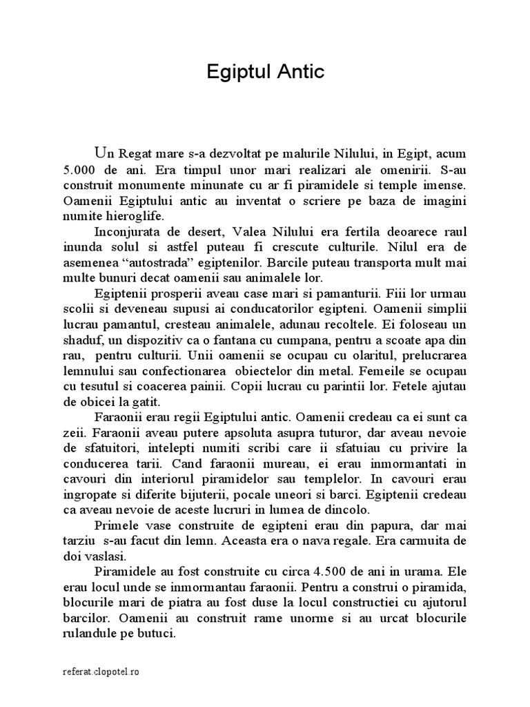 5.000 de ani. Era timpul unor mari realizari ale omenirii. S-au construit monumente minunate cu ar fi piramidele si temple imense. Oamenii Egiptului antic au inventat o scriere pe baza de imagini numite ieroglife. !ncon"urata de desert, #alea Nilului era fertila deoarece raul inunda solul si astfel puteau fi crescute culturile. Nilul era de asemenea $autostrada% egiptenilor. &arcile puteau transporta mult mai multe bunuri decat oamenii sau animalele lor. Egiptenii prosperii aveau case mari si pamanturii. 'iii lor urmau scolii si deveneau supusi ai conducatorilor egipteni. Oamenii simplii lucrau pamantul, cresteau animalele, adunau recoltele. Ei foloseau un s aduf, un dispozitiv ca o fantana cu cumpana, pentru a scoate apa din rau, pentru culturii. Unii oamenii se ocupau cu olaritul, prelucrarea lemnului sau confectionarea obiectelor din metal. 'emeile se ocupau cu tesutul si coacerea painii. (opii lucrau cu parintii lor. 'etele a"utau de obicei la gatit. 'araonii erau regii Egiptului antic. Oamenii credeau ca ei sunt ca zeii. 'araonii aveau putere apsoluta asupra tuturor, dar aveau nevoie de sfatuitori, intelepti numiti scribi care ii sfatuiau cu privire la conducerea tarii. (and faraonii mureau, ei erau inmormantati in cavouri din interiorul piramidelor sau templelor. !n cavouri erau ingropate si diferite bi"uterii, pocale uneori si barci. Egiptenii credeau ca aveau nevoie de aceste lucruri in lumea de dincolo. )rimele vase construite de egipteni erau din papura, dar mai tarziu s-au facut din lemn. *ceasta era o nava regale. Era carmuita de doi vaslasi. )iramidele au fost construite cu circa +.500 de ani in urama. Ele erau locul unde se inmormantau faraonii. )entru a construi o piramida, blocurile mari de piatra au fost duse la locul constructiei cu a"utorul barcilor. Oamenii au construit rame unorme si au urcat blocurile rulandule pe butuci.