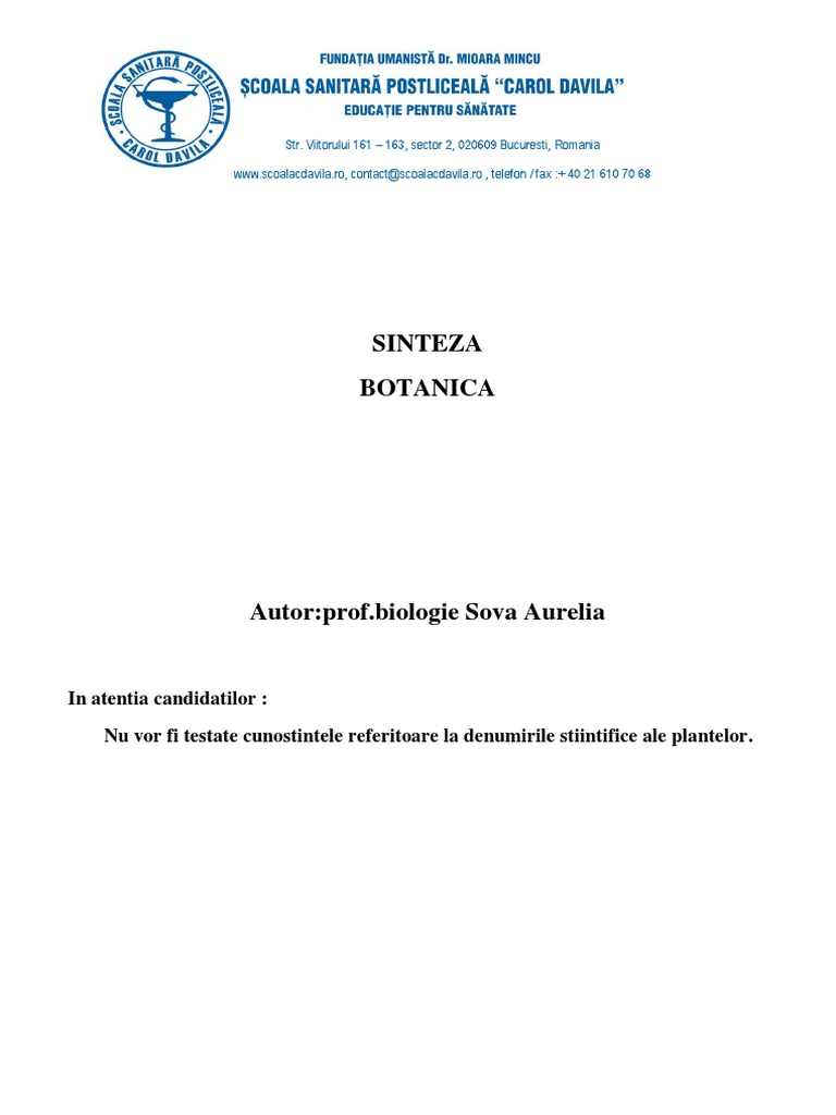 In atentia candidatilor : Nu vor fi testate cunostintele referitoare la denumirile stiintifice ale plantelor.