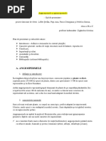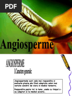 majoritatea florilor sunt hermafrodite(contin atat organe reproducatoare femeiesti cat si organe reproducatoare barbatesti)(fig.1.A); la arbori florile sunt unisexuate ([Link] stejar, fag, etc); polenizarea se realizeaza cu ajutorul : - insectelor - vantului la cele cu invelisuri florale reduse fecundatia - este dubla :- participa: - cele 2 spermatii (gameti masculini) formate in graunciorul de polen; (fig.1.C) - oosfera(gametul femel )si nucleul secundar din sacul embrionar format in ovul; - o spermatie fecundeaza oosfera zigotul principal din care se va forma embrionul; - cealalta spermatie fecundeaza nucleul secundar zigotul accesoriu din care se va forma albumenul sau endospermul (tesut nutritiv al embrionului); - este independenta de mediul acvatic; fructul se formeaza din peretii ovarului in urma procesului de fecundatie; samanta se formeaza din ovulul fecundat; - alcatuire : - tegument seminal (fig.2 ) - embrion format din : - radicula - tulpinita - muguras(gemula) - un cotiledon angiosperme monocotiledonate sau - doua cotiledoane angiosperme dicotiledonate
