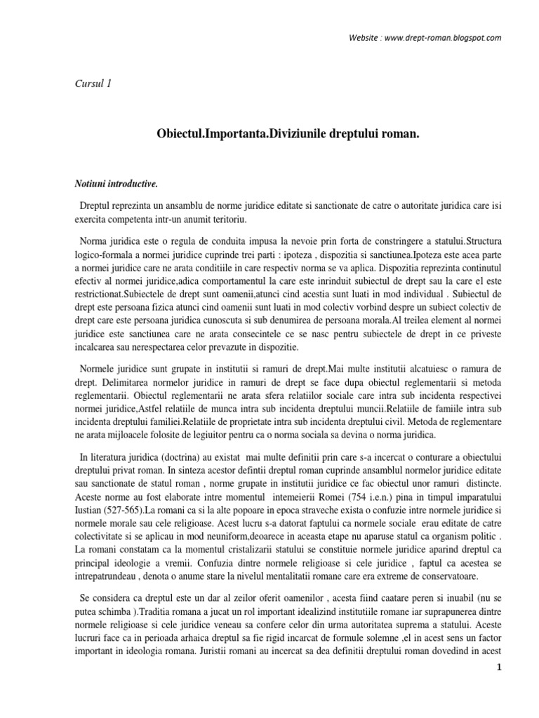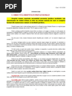 Notiuni introductive. Dreptul reprezinta un ansamblu de norme juridice editate si sanctionate de catre o autoritate juridica care isi exercita competenta intr-un anumit teritoriu. Norma juridica este o regula de conduita impusa la nevoie prin forta de constringere a [Link] logico-formala a normei juridice cuprinde trei parti : ipoteza , dispozitia si [Link] este acea parte a normei juridice care ne arata conditiile in care respectiv norma se va aplica. Dispozitia reprezinta continutul efectiv al normei juridice,adica comportamentul la care este inrinduit subiectul de drept sau la care el este [Link] de drept sunt oamenii,atunci cind acestia sunt luati in mod individual . Subiectul de drept este persoana fizica atunci cind oamenii sunt luati in mod colectiv vorbind despre un subiect colectiv de drept care este persoana juridica cunoscuta si sub denumirea de persoana [Link] treilea element al normei juridice este sanctiunea care ne arata consecintele ce se nasc pentru subiectele de drept in ce priveste incalcarea sau nerespectarea celor prevazute in dispozitie. Normele juridice sunt grupate in institutii si ramuri de [Link] multe institutii alcatuiesc o ramura de drept. Delimitarea normelor juridice in ramuri de drept se face dupa obiectul reglementarii si metoda reglementarii. Obiectul reglementarii ne arata sfera relatiilor sociale care intra sub incidenta respectivei normei juridice,Astfel relatiile de munca intra sub incidenta dreptului [Link] de famiile intra sub incidenta dreptului [Link] de proprietate intra sub incidenta dreptului civil. Metoda de reglementare ne arata mijloacele folosite de legiuitor pentru ca o norma sociala sa devina o norma juridica. In literatura juridica (doctrina) au existat mai multe definitii prin care s-a incercat o conturare a obiectului dreptului privat roman. In sinteza acestor defintii dreptul roman cuprinde ansamblul normelor juridice editate sau sanctionate de statul roman , norme grupate in institutii juridice ce fac obiectul unor ramuri distincte. Aceste norme au fost elaborate intre momentul intemeierii Romei (754 i.e.n.) pina in timpul imparatului Iustian (527-565).La romani ca si la alte popoare in epoca straveche exista o confuzie intre normele juridice si normele morale sau cele religioase. Acest lucru s-a datorat faptului ca normele sociale erau editate de catre colectivitate si se aplicau in mod neuniform,deoarece in aceasta etape nu aparuse statul ca organism politic . La romani constatam ca la momentul cristalizarii statului se constituie normele juridice aparind dreptul ca principal ideologie a vremii. Confuzia dintre normele religioase si cele juridice , faptul ca acestea se intrepatrundeau , denota o anume stare la nivelul mentalitatii romane care era extreme de conservatoare. Se considera ca dreptul este un dar al zeilor oferit oamenilor , acesta fiind caatare peren si inuabil (nu se putea schimba ).Traditia romana a jucat un rol important idealizind institutiile romane iar suprapunerea dintre normele religioase si cele juridice veneau sa confere celor din urma autoritatea suprema a statului. Aceste lucruri face ca in perioada arhaica dreptul sa fie rigid incarcat de formule solemne ,el in acest sens un factor important in ideologia romana. Juristii romani au incercat sa dea definitii dreptului roman dovedind in acest 1