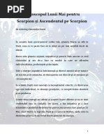 Va fi un an financiar puternic i prosper pentru nativii Scorpion. Bucurai-v. Casa a 2-a, a veniturilor provenite din munc proprie este puternic, ceea ce arat c finanele sunt un domeniu de interes i de importan pentru ei. Sunt axai pe finane i se concentreaz pe varii modaliti de a face bani tiind c planificarea reprezint ctig. Jupiter, planeta norocului, este, n prima parte a anului, n poziia sa cea mai nalt, n Rac, n Casa a 9-a, a studiilor academice, a credinei, a strintii i face aspecte frumoase cu Soarele n cea mai mare parte a anului. Deci norocul financiar le surde nativilor Scorpion. Toate acest lucruri se traduc prin venituri sporite i neateptate. Obiectivele lor financiare sunt mari, mai mari, a spune, dect viaa. Ei nu sunt interesai doar n a-i ctiga traiul ct de a strnge avere. Vor exist multe oportuniti financiare, unele provenite din mediul academic, altele din terenuri n strintate dar i din relaiile de afaceri cu strintatea. n viaa lor financiar par a fi implicate instituii religioase sau preoi i ntr-un mod foarte benefic. De asemenea, speculaiile financiare le sunt favorabile. Norocul este de partea lor n toate investiiile i achiziiile pe care le fac, activele pe care le dein vor cretere ca valoare. Exit o vorb, sunt dintre cei care cred c pot i dintre cei care cred c nu pot. Scorpionii fac parte dintre cei care cred c pot. ntotdeauna sunt locul potrivit, la momentul potrivit, s recunoasc i s profite de o oportunitate. Pe de alt parte, ctigul salarial este un mod de a-i ctiga existena confortabil, conform cu natura i talentul lor i acest lucru este foarte important. Pot fi ei nsui i mai prosperi. Jupiter face aspecte frumoase cu Soarele lor pn la 1 august iar dup aceea cu Pluto, stpnul lor planetar istpnul bogiilor subterane. Ambele planete implic aspectul fizic, imaginea i prestana, un melanj excelent pentru succes, haina este imaginea bunstrii i este un factor important n ctig, deci probabil, c vor purta numai haine de firm anul acesta, cu toate c Scorpionii, prin natura lor, nu sunt semne ostentative, dimpotriv le place s-i ascund farmecele. La 1 august Jupiter le va trece peste Mijlocul Cerului, punctul cel mai puternic al temei natale, deci se vor bucura de un plus de Imagine dar i de avere. Mijlocul Cerului, punct diferit pentru fiecare dintre noi, n funcie de ziua de natere, este pragul Casei a 10-a, casa carierei. Aa c aceast trece nu aduce doar bani, ci i prestigiu, onoruri, recunoatere i promovare la locul de munc. n multe situaii, este vorba despre implicare n problemele comunitii n care triesc sau dac fac politic, n problemele rii, n sensul bun al cuvntului. Vorbim aici despre relaii cu oameni importani i cu putere. Politicienii de profesie vor ctiga alegerile europarlamentare, s spunem. Multi dintre ei vor contribui financiar la campanii politice i muli dintre ei, vor beneficia, la nivel financiar de conexiuni politice. Cei mari i puternici sunt cu ei i sunt dornici s le acorde atenia lor. Oportuniti noi i bune n carier. Cerul este limita. Scorpionii care sunt studeni vor fi acceptai n universiti din strintate, alii vor ctiga burse de studiu, le va fi recunoscut munca de cercetare. Vor fi foarte generoi n acest an, att cu prietenii ct i n ce privesc faptele caritabile, n schimb, ceea ce nu i prea st n caracter, va fi un mare cheltuitor. 36