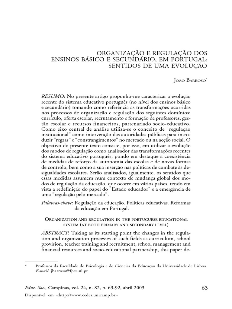 BARROSO, J. et al. Analyse de l’évolution des modes de régulation institutionnalisée dans le système éducatif du Portugal. Lisboa: Facul- dade de Psicologia e de Ciências da Educação de Lisboa. Disponível em: <http://www.fpce.ul.pt/centros/ceescola — http://www.fpce.ul.pt/ centros/ceescola> Acesso em 2002.