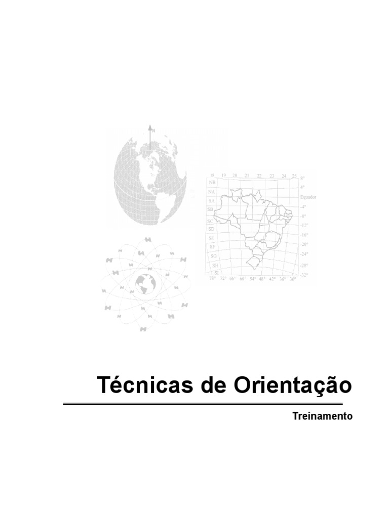 1 - CONCEITOS BSICOS............................................................................................................................... 1 1.1 Norte Magntico e Geogrfico................................................................................................................... 1 a) Direo Norte Magntico............................................................................................................................ 1 b) Direo Norte Geogrfico ou Verdadeiro................................................................................................... 1 1.2 - Azimute ...................................................................................................................................................... 2 1.3 Rumo.......................................................................................................................................................... 3 1.4 - Converso entre Rumo e Azimute.............................................................................................................. 4 1.5 - Exemplo de aplicao de Rumo e Azimute ................................................................................................ 5 1.6 Declinao Magntica................................................................................................................................ 8 a) Conceitos ................................................................................................................................................... 8 b) Clculo da Declinao Magntica .............................................................................................................. 9 c) Transformao de Norte Magntico em Geogrfico e vice-versa............................................................. 14 1.7 Bssolas .................................................................................................................................................... 15 1.7.1- Inverso dos Pontos E e W da bssola ....................................................................................... 15 1.7.2 Utilizao ......................................................................................................................................... 16 1.7.3 - Cuidados ........................................................................................................................................... 17 1.8 Mtodos de Determinao do Norte Verdadeiro ..................................................................................... 17 2 - INTRODUO AO SISTEMA GPS.......................................................................................................... 19 2.1 - Sistemas de Coordenadas ......................................................................................................................... 19 2.2 - Coordenadas Geogrficas. ........................................................................................................................ 20 2.3 - Coordenadas Geodsicas .......................................................................................................................... 21 2.4 - Sistema Geodsico Brasileiro ................................................................................................................... 22 2.5 - Sistema GPS ............................................................................................................................................. 23 2.5.1 - Segmento Espacial............................................................................................................................. 24 2.5.2 -Segmento de controle ......................................................................................................................... 26 2.5.3 - Segmento de Usurios ....................................................................................................................... 26 2.5.4- Princpio bsico do Posicionamento por GPS .................................................................................... 27 2.5.5 - Tipos de Observao ......................................................................................................................... 28 2.5.6 - Posicionamento.................................................................................................................................. 29 2.5.6.1 Posicionamento Absoluto .......................................................................................................... 29 2.5.6.2 Posicionamento Relativo............................................................................................................ 30 2.5.6.3 - Tcnicas de observao Posicionamento relativo.................................................................... 30 2.5.7 - As coordenadas GPS ......................................................................................................................... 34 2.5.8 - Receptores GPS ................................................................................................................................. 34 2.5.9 - Exemplos de Aplicaes GPS ........................................................................................................... 36 2.5.10 Consideraes sobre o uso de receptores GPS no modo absoluto. ................................................. 37 3 - INTRODUO AO USO DE MAPAS ...................................................................................................... 38 3.1 - Sistema UTM ........................................................................................................................................... 43 3.1.1 - Convergncia de Meridianos ............................................................................................................. 48 3.2 Exerccios de Cartografia......................................................................................................................... 50