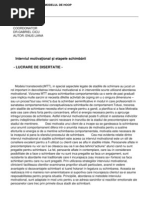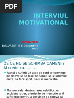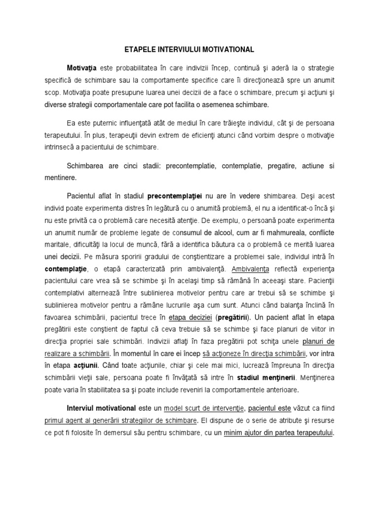 la comportamente specifice care i direcioneaz spre un anumit scop. Motivaia poate presupune luarea unei decizii de a face o schimbare, precum i aciuni i diverse strategii comportamentale care pot facilita o asemenea schimbare. Ea este puternic influenat att de mediul n care triete individul, ct i de persoana terapeutului. n plus, terapeuii devin extrem de eficieni atunci cnd vorbim despre o motivaie intrinsec a pacientului de schimbare. Schimbarea are cinci stadii: precontemplatie, contemplatie, pregatire, actiune si mentinere. Pacientul aflat n stadiul precontemplaiei nu are n vedere shimbarea. Dei acest individ poate experimenta distres n legtur cu o anumit problem, el nu a identificat-o nc i nu este privit ca o problem care necesit atenie. De exemplu, o persoan poate experimenta un anumit numr de probleme legate de consumul de alcool, cum ar fi mahmureala, conflicte maritale, dificulti la locul de munc, fr a identifica butura ca o problem ce merit luarea unei decizii. Pe msura sporirii gradului de contientizare a problemei sale, individul intr n contemplaie, o etap caracterizat prin ambivalen. Ambivalena reflect experiena pacientului care vrea s se schimbe i n acelai timp s rmn n aceeai stare. Pacienii contemplativi alterneaz ntre sublinierea motivelor pentru care ar trebui s se schimbe i sublinierea motivelor pentru a rmne lucrurile aa cum sunt. Atunci cnd balana nclin n favoarea schimbrii, pacientul trece n etapa deciziei (pregtirii). Un pacient aflat n etapa pregtirii este contient de faptul c ceva trebuie s se schimbe i face planuri de viitor in direcia propriei sale schimbri. Indivizii aflai n faza pregtirii pot schia unele planuri de realizare a schimbrii. n momentul n care ei ncep s acioneze n direcia schimbrii, vor intra n etapa aciunii. Cnd toate aciunile, chiar i cele mai mici, lucreaz mpreuna n direcia schimbrii vieii sale, persoana poate fi nvat s intre n stadiul meninerii. Meninerea poate varia n stabilitatea sa i poate include reveniri la comportamentele anterioare. Interviul motivational este un model scurt de intervenie, pacientul este vzut ca fiind primul agent al generrii strategiilor de schimbare. El dispune de o serie de atribute i resurse ce pot fi folosite n demersul su pentru schimbare, cu un minim ajutor din partea terapeutului.