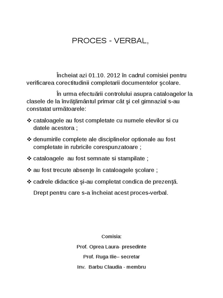 ncheiat azi 01.10. 2012 n cadrul c !i"iei #entru $eri%icarea c rectitudinii c !#letarii d cu!entel r &c lare. n ur!a e%ectu'rii c ntr lului a"u#ra catal a(el r la cla"ele de la n$')'!*ntul #ri!ar c*t &i cel (i!nazial "-au c n"tatat ur!'t arele+ catal a(ele au % "t c !#letate cu nu!ele ele$il r "i cu datele ace"t ra , denu!irile c !#lete ale di"ci#linel r #ti nale au % "t c !#letate in ru-ricile c re"#unzat are , catal a(ele au % "t "e!nate "i "ta!#ilate , au % "t trecute a-"en)e n catal a(ele &c lare , cadrele didactice &i-au c !#letat c ndica de #rezen)'. .re#t #entru care "-a ncheiat ace"t #r ce"-$er-al.
