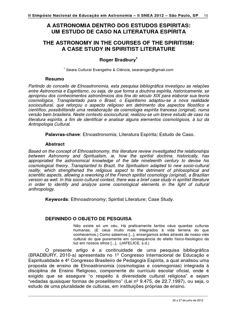 O presente artigo a continuidade de uma pesquisa bibliogrfica (BRADBURY, 2010-a) apresentada no 1 Congresso Internacional de Educao e Espiritualidade e 4 Congresso Brasileiro de Pedagogia Esprita, a qual analisou uma proposta de ensino de Etnoastronomia (cosmologias e cosmogonias) integrada disciplina de Ensino Religioso, componente do currculo escolar oficial, onde exigido que se assegure o respeito diversidade cultural religiosa e sejam vedadas quaisquer formas de proselitismo (Lei n 9.475, de 22.7.1997), ou seja, o estudo de uma pluralidade de culturas, em instituies prprias de ensino.