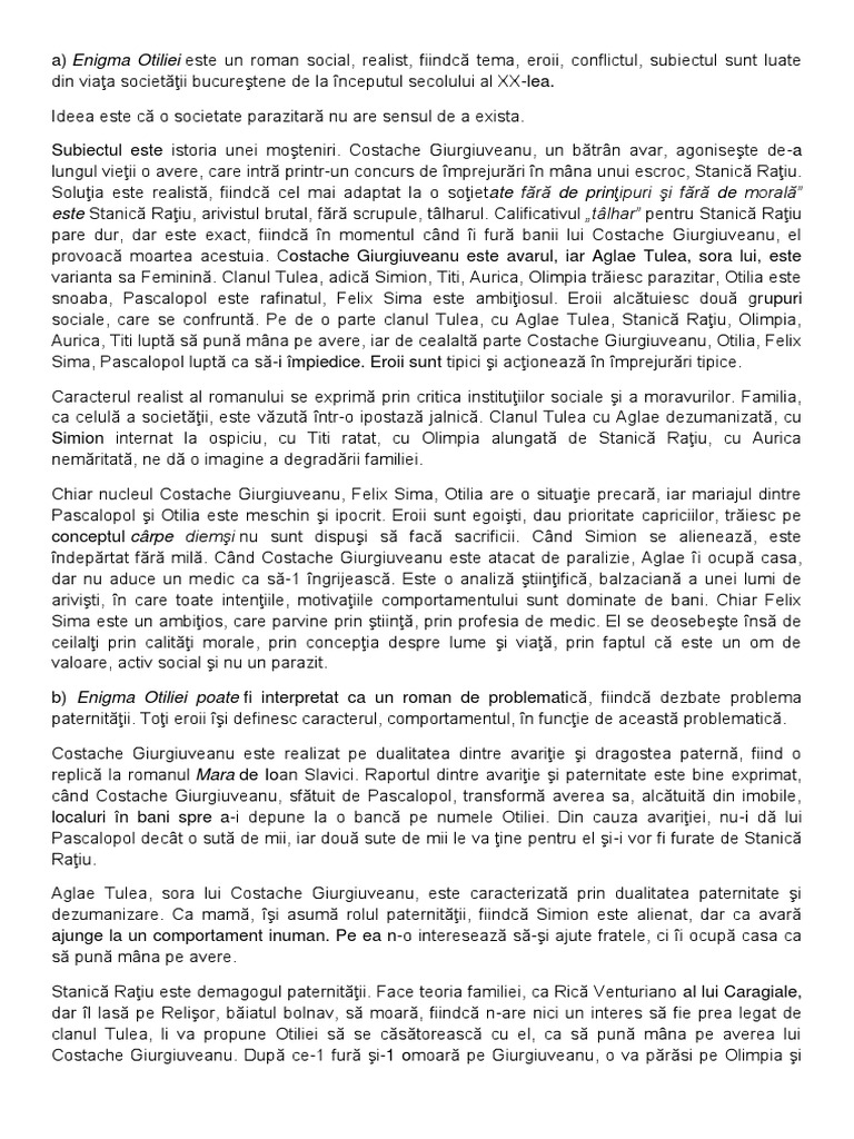 societii bucuretene de la nceputul secolului al XX-lea. Ideea este c o societate parazitar nu are sensul de a exista. Subiectul este istoria unei moteniri. Costache Giurgiuveanu, un btrn avar, agonisete de -a lungul vieii o avere, care intr printr-un concurs de mprejurri n mna unui escroc, Stanic Raiu. Soluia este realist, fiindc cel mai adaptat la o soietate fr de prinipuri i fr de moral este Stanic Raiu, arivistul brutal, fr scrupule, tlharul. Calificativul tlhar pentru Stanic Raiu pare dur, dar este exact, fiindc n momentul cnd i fur banii lui Costache Giurgiuveanu, el provoac moartea acestuia. Costache Giurgiuveanu este avarul, iar Aglae Tulea, sora lui, este varianta sa Feminin. Clanul Tulea, adic Simion, Titi, Aurica, Olimpia triesc parazitar, Otilia este snoaba, Pascalopol este rafinatul, Felix Sima este ambiiosul. Eroii alctuiesc dou gr upuri sociale, care se confrunt. Pe de o parte clanul Tulea, cu Aglae Tulea, Stanic Raiu, Olimpia, Aurica, Titi lupt s pun mna pe avere, iar de cealalt parte Costache Giurgiuveanu, Otilia, Felix Sima, Pascalopol lupt ca s-i mpiedice. Eroii sunt tipici i acioneaz n mprejurri tipice. Caracterul realist al romanului se exprim prin critica instituiilor sociale i a moravurilor. Familia, ca celul a societii, este vzut ntr-o ipostaz jalnic. Clanul Tulea cu Aglae dezumanizat, cu Simion internat la ospiciu, cu Titi ratat, cu Olimpia alungat de Stanic Raiu, cu Aurica nemritat, ne d o imagine a degradrii familiei. Chiar nucleul Costache Giurgiuveanu, Felix Sima, Otilia are o situaie precar, iar mariajul dintre Pascalopol i Otilia este meschin i ipocrit. Eroii sunt egoiti, dau prioritate capriciilor, triesc pe conceptul crpe diemi nu sunt dispui s fac sacrificii. Cnd Simion se alieneaz, este ndeprtat fr mil. Cnd Costache Giurgiuveanu este atacat de paralizie, Aglae i ocup casa, dar nu aduce un medic ca s-1 ngrijeasc. Este o analiz tiinific, balzacian a unei lumi de ariviti, n care toate inteniile, motivaiile comportamentului sunt dominate de bani. Chiar Felix Sima este un ambiios, care parvine prin tiin, prin profesia de medic. El se deosebete ns de ceilali prin caliti morale, prin concepia despre lume i via, prin faptul c este un om de valoare, activ social i nu un parazit. b) Enigma Otiliei poate fi interpretat ca un roman de problematic, fiindc dezbate problema paternitii. Toi eroii i definesc caracterul, comportamentul, n funcie de aceast problematic. Costache Giurgiuveanu este realizat pe dualitatea dintre avariie i dragostea patern, fiind o replic la romanul Mara de Ioan Slavici. Raportul dintre avariie i paternitate este bine exprimat, cnd Costache Giurgiuveanu, sftuit de Pascalopol, transform averea sa, alctuit din imobile, localuri n bani spre a-i depune la o banc pe numele Otiliei. Din cauza avariiei, nu -i d lui Pascalopol dect o sut de mii, iar dou sute de mii le va ine pentru el i -i vor fi furate de Stanic Raiu. Aglae Tulea, sora lui Costache Giurgiuveanu, este caracterizat prin dualitatea paternitate i dezumanizare. Ca mam, i asum rolul paternitii, fiindc Simion este alienat, dar ca avar ajunge la un comportament inuman. Pe ea n-o intereseaz s-i ajute fratele, ci i ocup casa ca s pun mna pe avere. Stanic Raiu este demagogul paternitii. Face teoria familiei, ca Ric Venturiano al lui Caragiale, dar l las pe Relior, biatul bolnav, s moar, fiindc n -are nici un interes s fie prea legat de clanul Tulea, li va propune Otiliei s se cstoreasc cu el, ca s pun mna pe averea lui Costache Giurgiuveanu. Dup ce-1 fur i-1 omoar pe Giurgiuveanu, o va prsi pe Olimpia i