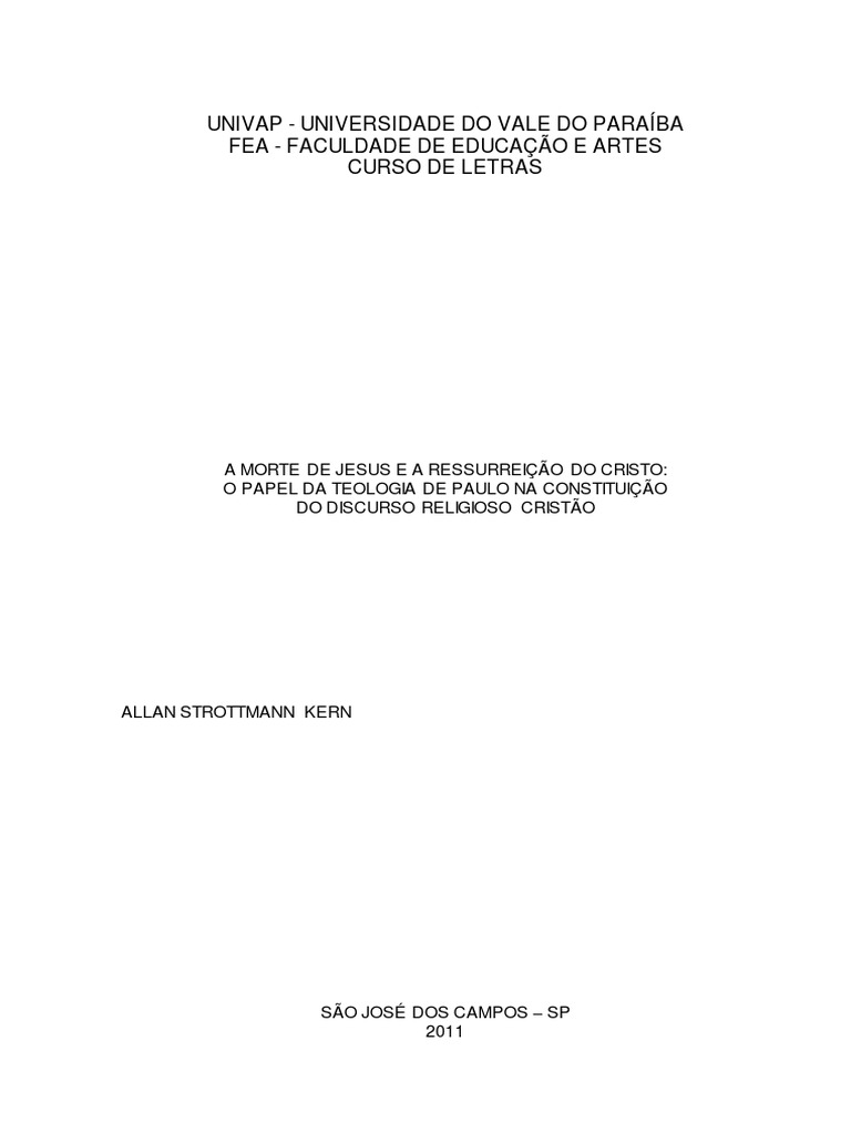 KERN, Allan Strottmann. A morte de Jesus e a ressurreio do Cristo: o papel da teologia de Paulo na constituio do discurso religioso cristo. Monografia de Concluso do Curso de Letras, da FEA Faculdade de Educao e Artes, da UNIVAP Universidade do Vale do Paraba. So Jos dos Campos/SP: Orientadora: Prof. M. Teresinha de Ftima Nogueira. Coorientador: Prof. Dr. Marco Antonio Villarta Neder. Apresentao em So Jos dos Campos, SP, em 16 de dezembro de 2011.