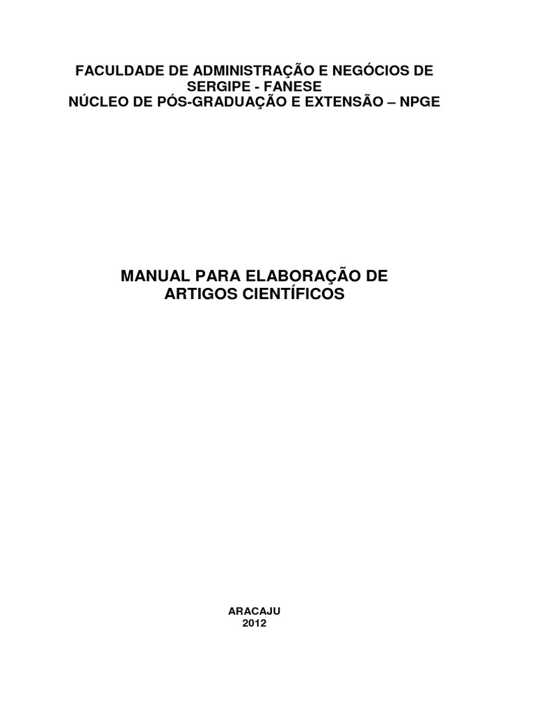 A apresentao dos trabalhos acadmicos obedece s regras de padronizao reconhecidas por toda a comunidade cientfica. Este manual para elaborao de artigo cientfico baseado nas normas da Associao Brasileira de Normas Tcnicas (ABNT), considerando ser este rgo responsvel pela normalizao tcnica brasileira. Tem como finalidade padronizar os artigos cientficos a serem apresentados como Trabalho de Concluso de Curso ao Ncleo de Ps-Graduao e Extenso da Faculdade de Administrao e Negcios de Sergipe.