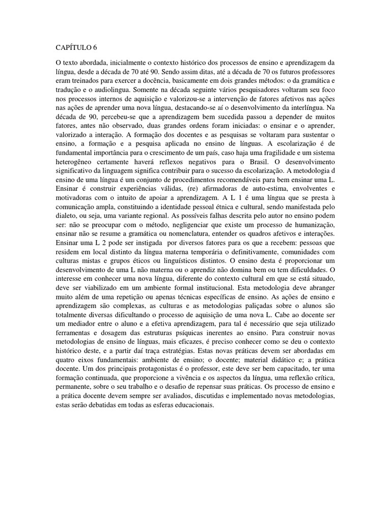 Sendo assim ditas, at a dcada de 70 os futuros professores eram treinados para exercer a docncia, basicamente em dois grandes mtodos: o da gramtica e traduo e o audiolingua. Somente na dcada seguinte vrios pesquisadores voltaram seu foco nos processos internos de aquisio e valorizou-se a interveno de fatores afetivos nas aes nas aes de aprender uma nova lngua, destacando-se a o desenvolvimento da interlngua. Na dcada de 90, percebeu-se que a aprendizagem bem sucedida passou a depender de muitos fatores, antes no observado, duas grandes ordens foram iniciadas: o ensinar e o aprender, valorizado a interao. A formao dos docentes e as pesquisas se voltaram para sustentar o ensino, a formao e a pesquisa aplicada no ensino de lnguas. A escolarizao de fundamental importncia para o crescimento de um pas, caso haja uma fragilidade e um sistema heterogneo certamente haver reflexos negativos para o Brasil. O desenvolvimento significativo da linguagem significa contribuir para o sucesso da escolarizao. A metodologia d ensino de uma lngua um conjunto de procedimentos recomendveis para bem ensinar uma L. Ensinar construir experincias vlidas, (re) afirmadoras de auto-estima, envolventes e motivadoras com o intuito de apoiar a aprendizagem. A L 1 uma lngua que se presta comunicao ampla, constituindo a identidade pessoal tnica e cultural, sendo manifestada pelo dialeto, ou seja, uma variante regional. As possveis falhas descrita pelo autor no ensino podem ser: no se preocupar com o mtodo, negligenciar que existe um processo de humanizao, ensinar no se resume a gramtica ou nomenclatura, entender os quadros afetivos e interaes. Ensinar uma L 2 pode ser instigada por diversos fatores para os que a recebem: pessoas que residem em local distinto da lngua materna temporria o definitivamente, comunidades com culturas mistas e grupos ticos ou lingusticos distintos. O ensino desta proporcionar um desenvolvimento de uma L no materna ou o aprendiz no domina bem ou tem dificuldades. O interesse em conhecer uma nova lngua, diferente do contexto cultural em que se est situado, deve ser viabilizado em um ambiente formal institucional. Esta metodologia deve abranger muito alm de uma repetio ou apenas tcnicas especficas de ensino. As aes de ensino e aprendizagem so complexas, as culturas e as metodologias paliadas sobre o alunos so totalmente diversas dificultando o processo de aquisio de uma nova L. Cabe ao docente ser um mediador entre o aluno e a efetiva aprendizagem, para tal necessrio que seja utilizado ferramentas e dosagem das estruturas psquicas inerentes ao ensino. Para construir novas metodologias de ensino de lnguas, mais eficazes, preciso conhecer como se deu o contexto histrico deste, e a partir da traa estratgias. Estas novas prticas devem ser abordadas em quatro eixos fundamentais: ambiente de ensino; o docente; material didtico e; a prtica docente. Um dos principais protagonistas o professor, este deve ser bem capacitado, ter uma formao continuada, que proporcione a vivncia e os aspectos da lngua, uma reflexo crtica, permanente, sobre o seu trabalho e o desafio de repensar suas prticas. Os processo de ensino e a prtica docente devem sempre ser avaliados, discutidas e implementado novas metodologias, estas sero debatidas em todas as esferas educacionais.