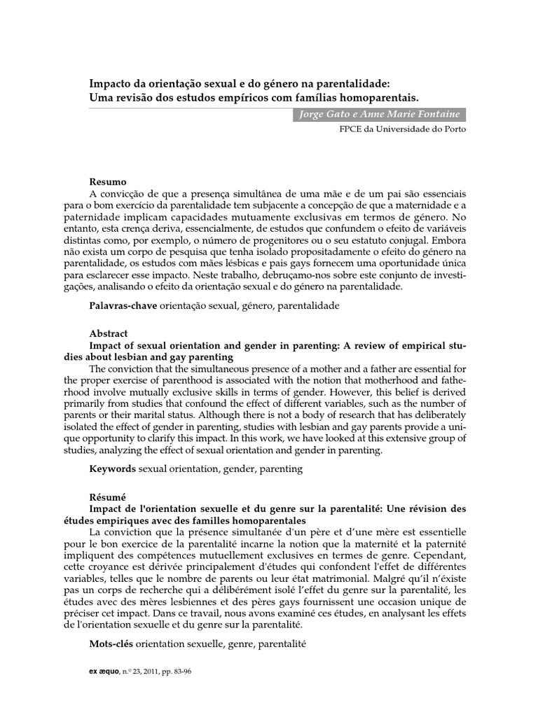 Resumo A convico de que a presena simultnea de uma me e de um pai so essenciais para o bom exerccio da parentalidade tem subjacente a concepo de que a maternidade e a paternidade implicam capacidades mutuamente exclusivas em termos de gnero. No entanto, esta crena deriva, essencialmente, de estudos que confundem o efeito de variveis distintas como, por exemplo, o nmero de progenitores ou o seu estatuto conjugal. Embora no exista um corpo de pesquisa que tenha isolado propositadamente o efeito do gnero na parentalidade, os estudos com mes lsbicas e pais gays fornecem uma oportunidade nica para esclarecer esse impacto. Neste trabalho, debruamo-nos sobre este conjunto de investigaes, analisando o efeito da orientao sexual e do gnero na parentalidade. Palavras-chave orientao sexual, gnero, parentalidade Abstract Impact of sexual orientation and gender in parenting: A review of empirical studies about lesbian and gay parenting The conviction that the simultaneous presence of a mother and a father are essential for the proper exercise of parenthood is associated with the notion that motherhood and fatherhood involve mutually exclusive skills in terms of gender. However, this belief is derived primarily from studies that confound the effect of different variables, such as the number of parents or their marital status. Although there is not a body of research that has deliberately isolated the effect of gender in parenting, studies with lesbian and gay parents provide a unique opportunity to clarify this impact. In this work, we have looked at this extensive group of studies, analyzing the effect of sexual orientation and gender in parenting. Keywords sexual orientation, gender, parenting Rsum Impact de l'orientation sexuelle et du genre sur la parentalit: Une rvision des tudes empiriques avec des familles homoparentales La conviction que la prsence simultane d'un pre et dune mre est essentielle pour le bon exercice de la parentalit incarne la notion que la maternit et la paternit impliquent des comptences mutuellement exclusives en termes de genre. Cependant, cette croyance est drive principalement d'tudes qui confondent l'effet de diffrentes variables, telles que le nombre de parents ou leur tat matrimonial. Malgr quil nxiste pas un corps de recherche qui a dlibrment isol leffet du genre sur la parentalit, les tudes avec des mres lesbiennes et des pres gays fournissent une occasion unique de prciser cet impact. Dans ce travail, nous avons examin ces tudes, en analysant les effets de l'orientation sexuelle et du genre sur la parentalit. Mots-cls orientation sexuelle, genre, parentalit
