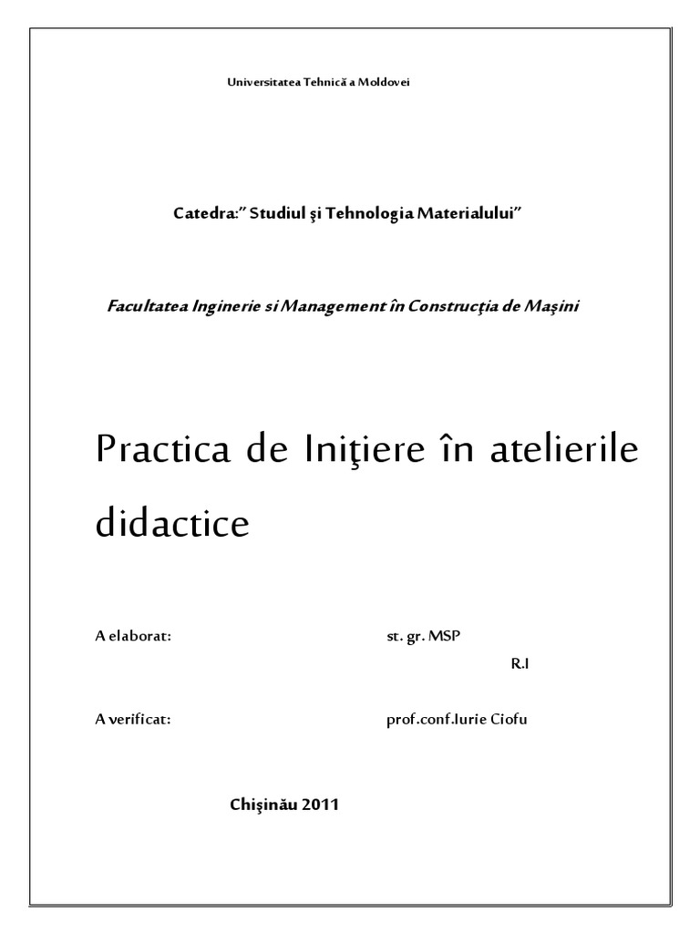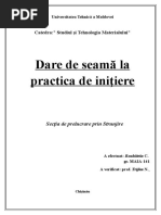 Raportul se stabileste n conformitate cu programa practicii de iniiere n atelierele didactice cu succesiunea lucrului ndeplinit n secii, separat pentru fiecare secie in parte. Practica de initiere reprezinta o disciplina destinata formarii bazei de viziuni si aptitudini ingineresti pentru studenti de specialitatile tehnologice-mecanice. Darea de seama contine informatii teoretice si tehnice in domeniile de confectionare ale semifabricatelor si pieselor finite si cunostinte in prelucrarea materialelor constructoare de masini prin diferite metode industriale.
