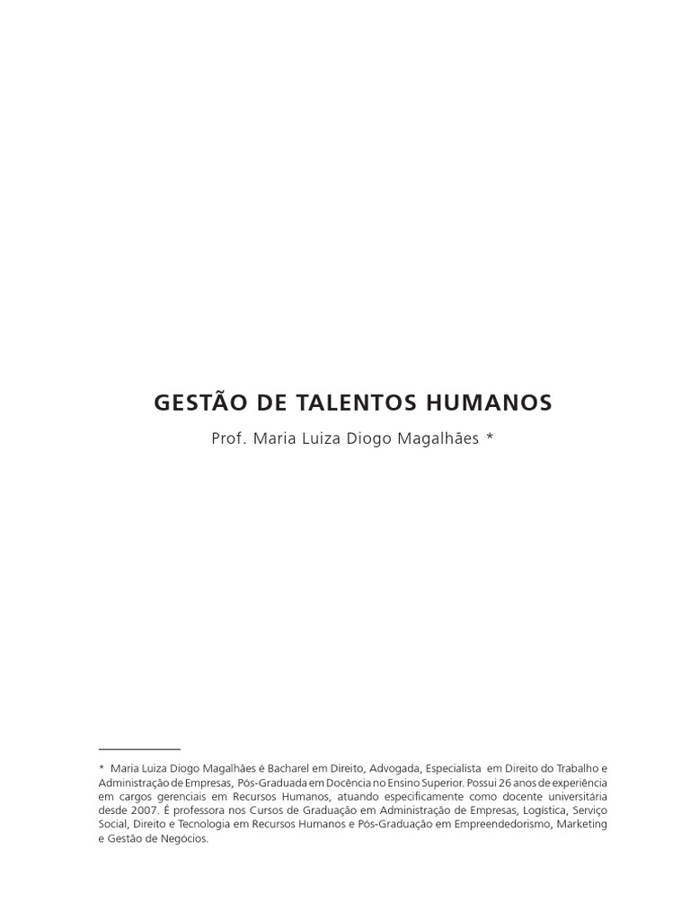 Bem-vindo(a) disciplina de Gesto de Talentos Humanos! um prazer t-lo(a) como aluno(a). Fico feliz em poder ajud-lo(a) nesta etapa to importante de sua vida: a consolidao dos conhecimentos no mundo acadmico. Lembre-se que a interdisciplinaridade essencial para o sucesso de seus estudos. Procure relacionar os temas aqui aprendidos com outras disciplinas. A disciplina de estudo uma caracterstica essencial para o(a) aluno(a) da educao a distncia. Cultive-a! Durante a elaborao deste material, procurei utilizar um vocabulrio de fcil entendimento. Alm disso, alguns formulrios e exerccios estaro disponveis durante a leitura, a fim de interagir com voc, visando um melhor aprendizado e fixao. A consulta peridica plataforma e o acompanhamento das teleaulas complementaro o entendimento adequado dos temas abordados. Este livro didtico est dividido em quatro unidades bsicas: Unidade 1 Planejamento Organizacional e Planejamento de Recursos Humanos Unidade 2 Administrao de Cargos e Salrios Unidade 3 Benefcios Unidade 4 Avaliao de Desempenho e Desenvolvimento de Pessoas Espero que voc aprecie a dinmica deste trabalho e tenha uma agradvel leitura!