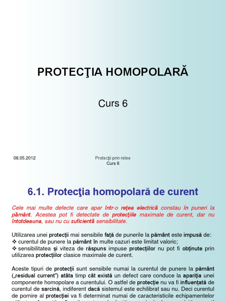 Cele mai multe defecte care apar ntr-o reea electric constau n puneri la pmnt. Acestea pot fi detectate de proteciile maximale de curent, dar nu ntotdeauna, sau nu cu suficient sensibilitate. Utilizarea unei protecii mai sensibile fa de punerile la pmnt este impus de: curentul de punere la pmnt n multe cazuri este limitat valoric; sensibilitatea i viteza de rspuns impuse proteciilor nu pot fi obinute prin utilizarea proteciilor clasice maximale de curent. Aceste tipuri de protecii sunt sensibile numai la curentul de punere la pmnt (residual current) atta timp ct exist un defect care conduce la apariia unei componente homopolare a curentului. O astfel de protecie nu va fi influenat de curentul de sarcin, indiferent dac sistemul este echilibrat sau nu. Deci curentul de pornire al proteciei va fi determinat numai de caracteristicile echipamentelor utilizate. Aceast afirmaie este adevrat numai dac nu exist cureni capacitivi sau de scurgere la pmnt ai cror valori s fie apropiate de valoarea de pornire a proteciei.
